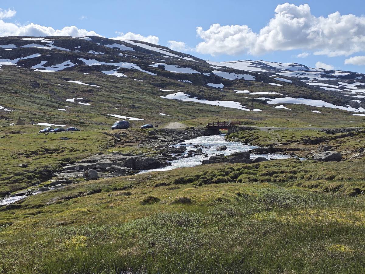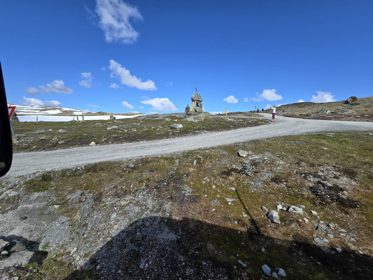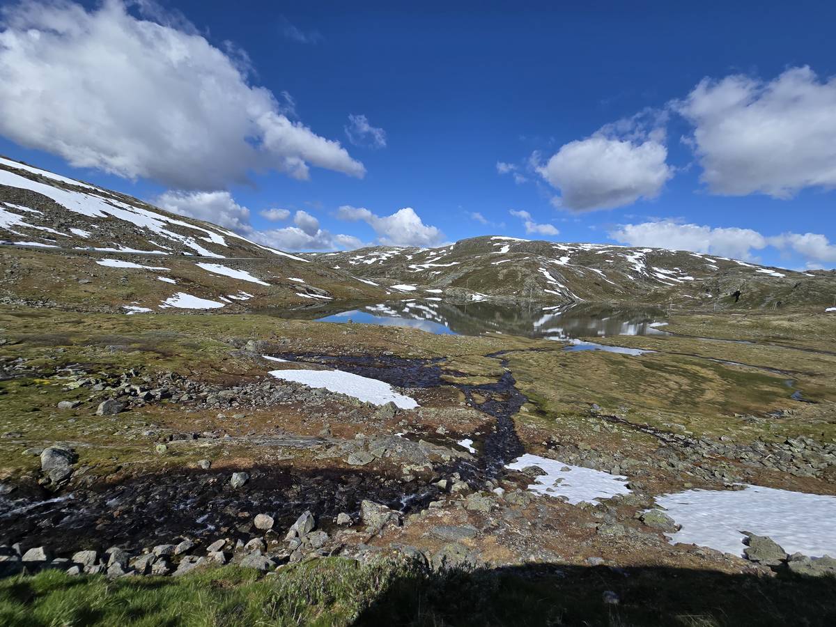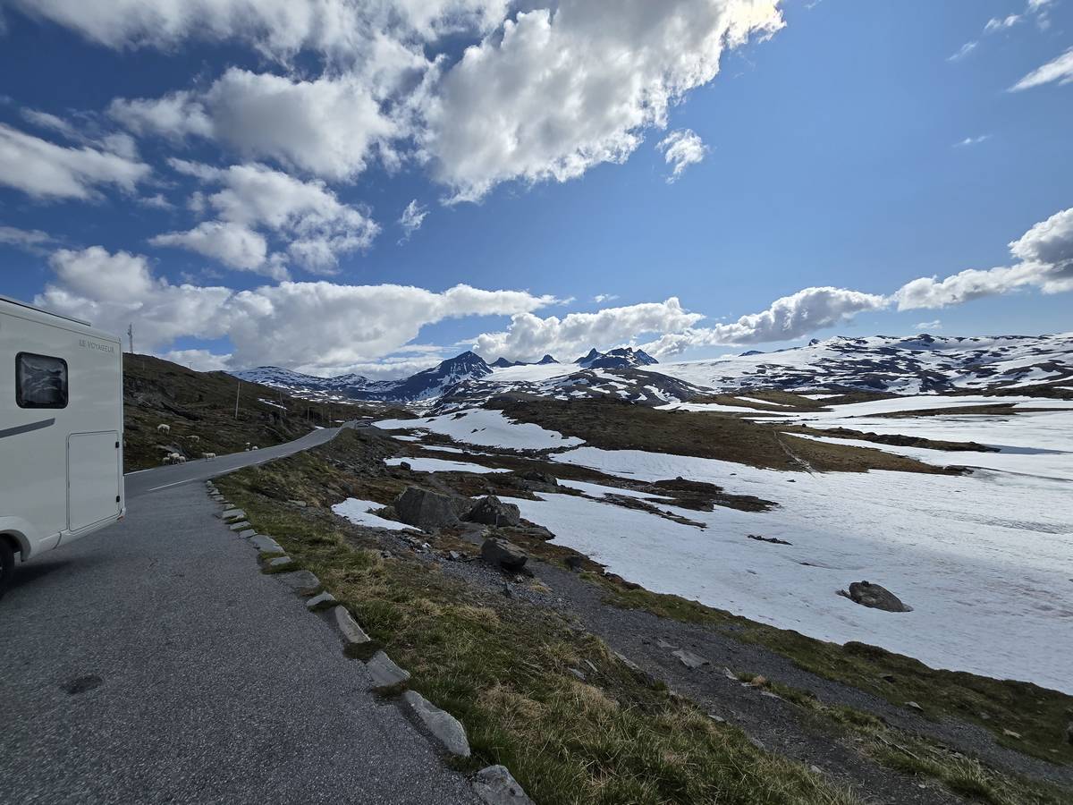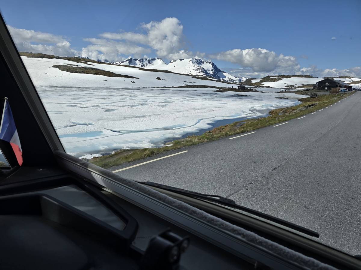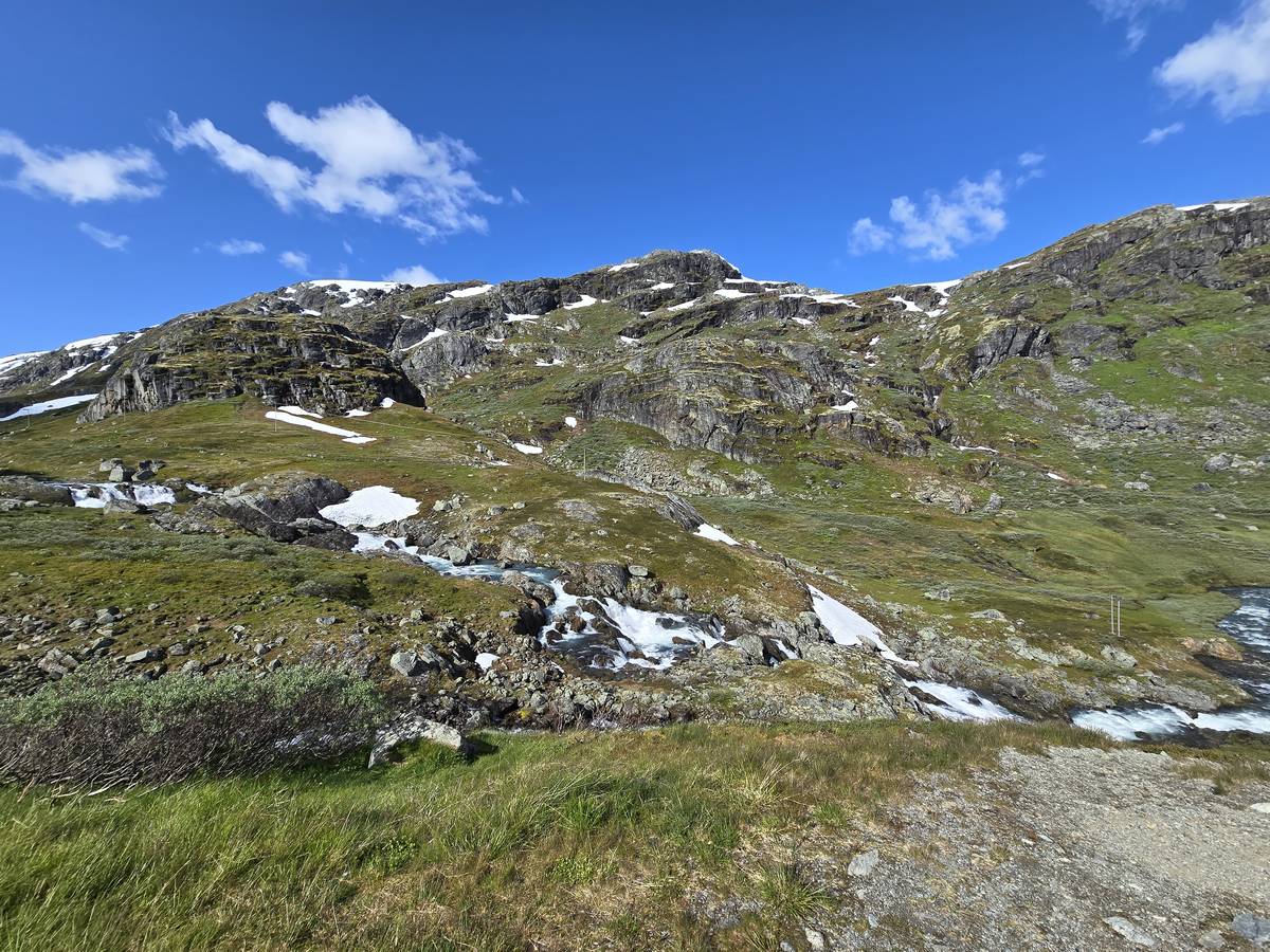 Quelques photos sur la route de Solvorn. Nous sommes sur un haut plateau d'environ 1200m d'altitude et nous cotoyons la neige. Comme partout en Norvège, nous pouvons y admirer les cascades toutes différentes et toutes plus belles les unes que les autres. Nous dormirons après Solvorn sur une aire de stationnement (Coordonnées : 61.283616, 7.164119)