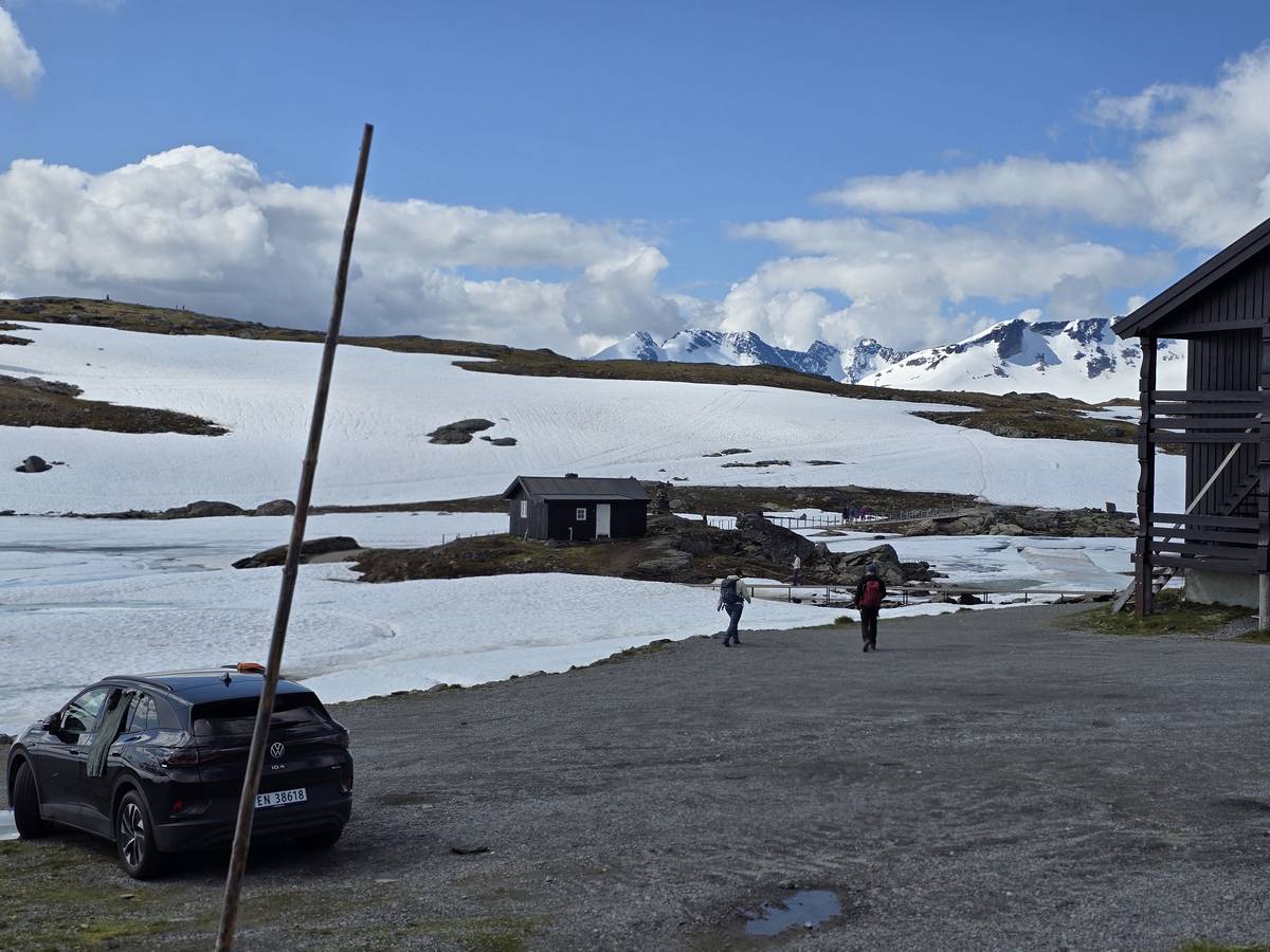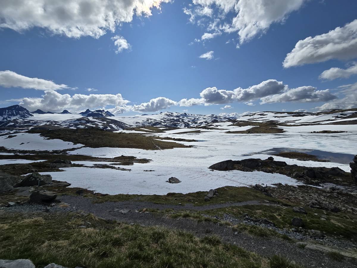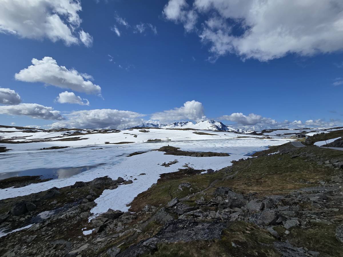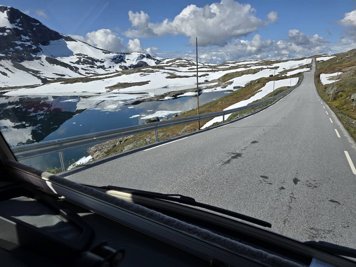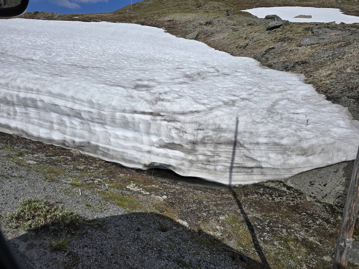 Quelques photos sur la route de Solvorn. Nous sommes sur un haut plateau d'environ 1200m d'altitude et nous cotoyons la neige. Comme partout en Norvège, nous pouvons y admirer les cascades toutes différentes et toutes plus belles les unes que les autres. Nous dormirons après Solvorn sur une aire de stationnement (Coordonnées : 61.283616, 7.164119)