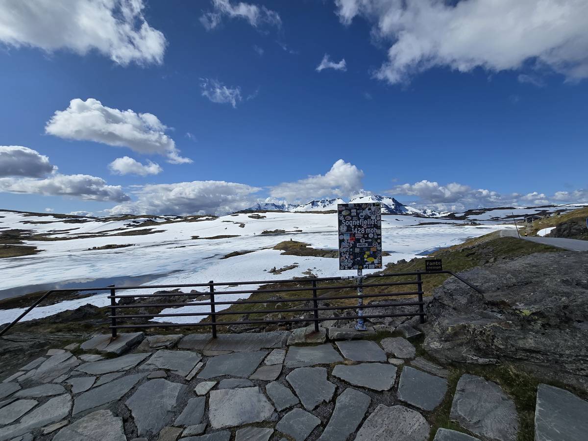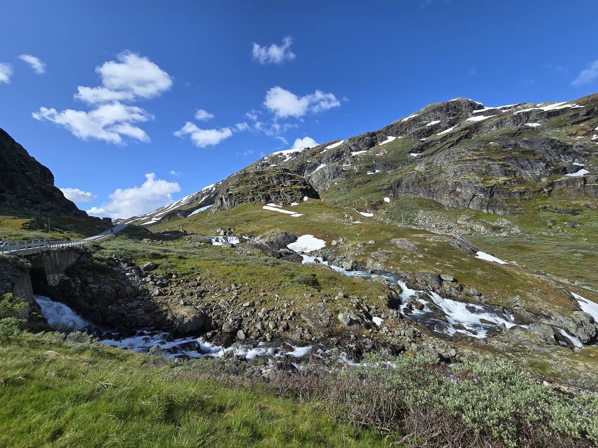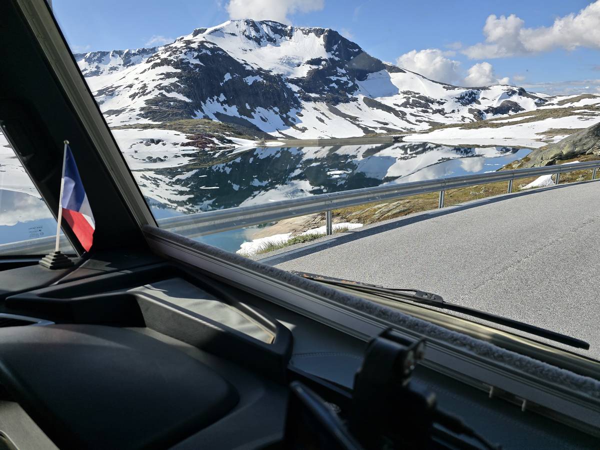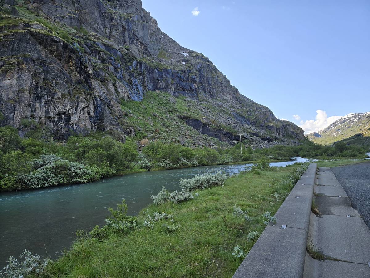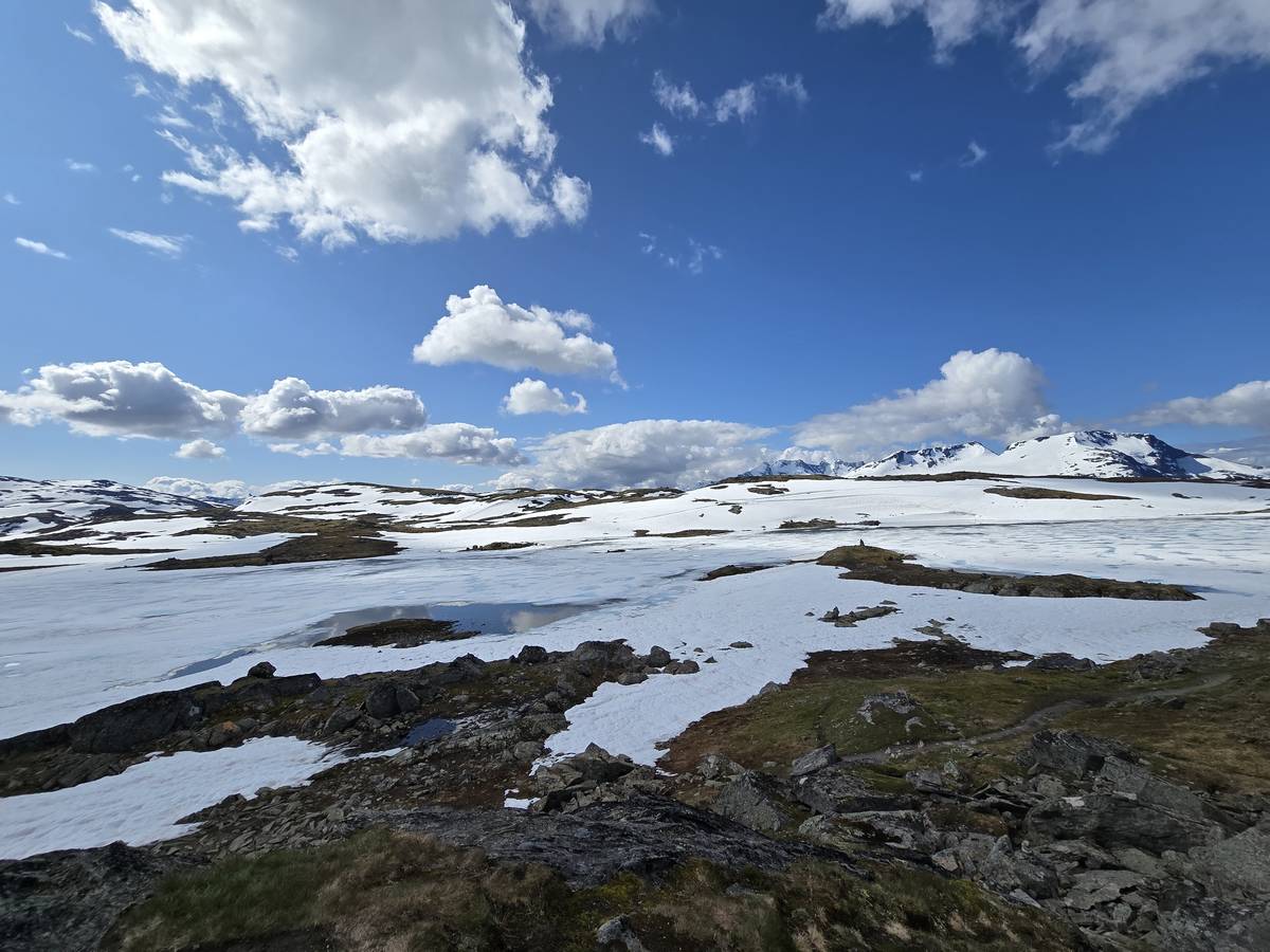 Quelques photos sur la route de Solvorn. Nous sommes sur un haut plateau d'environ 1200m d'altitude et nous cotoyons la neige. Comme partout en Norvège, nous pouvons y admirer les cascades toutes différentes et toutes plus belles les unes que les autres. Nous dormirons après Solvorn sur une aire de stationnement (Coordonnées : 61.283616, 7.164119)