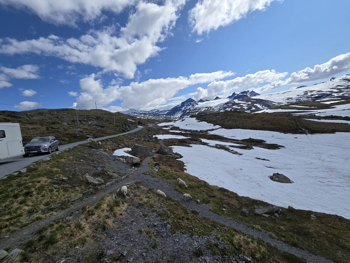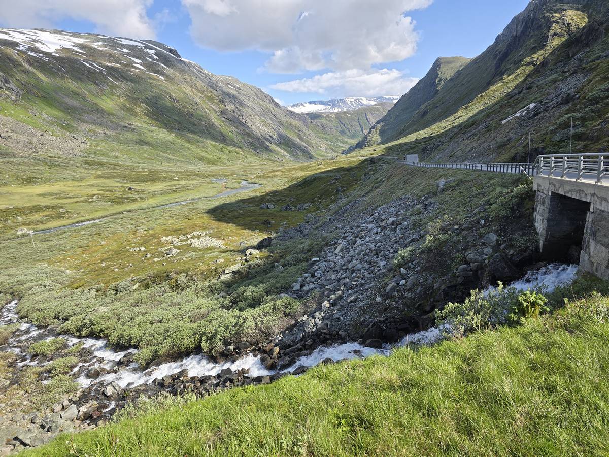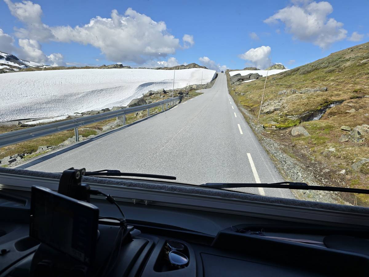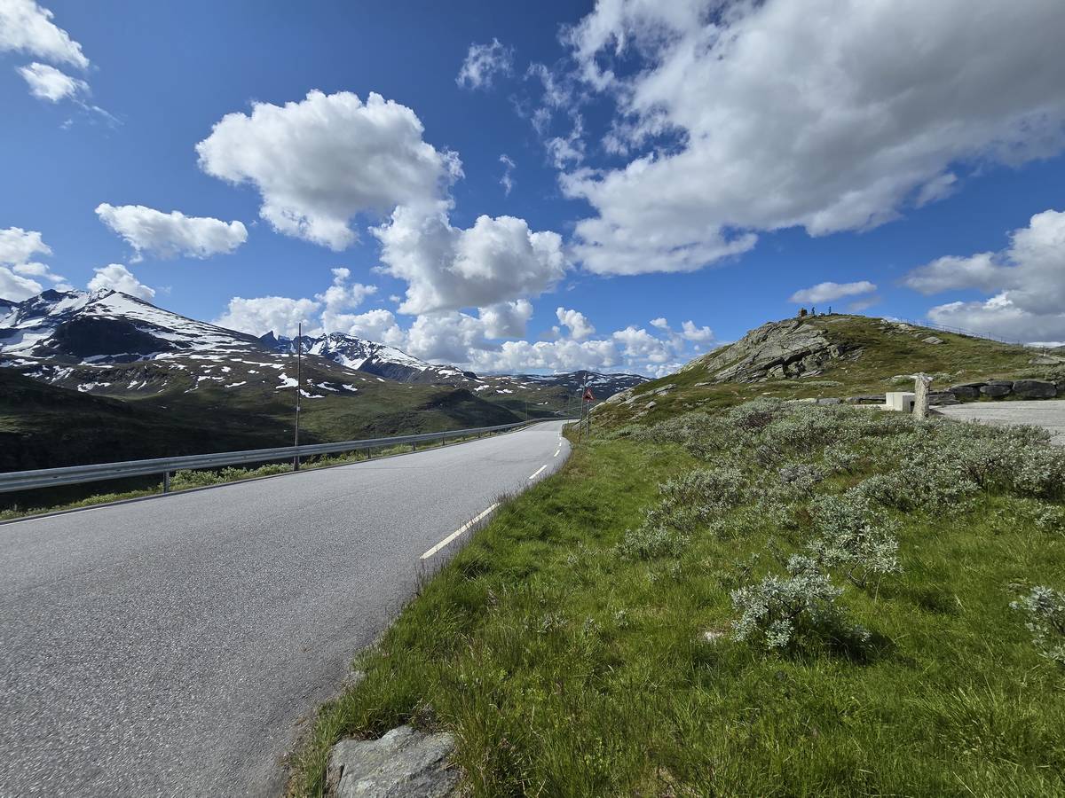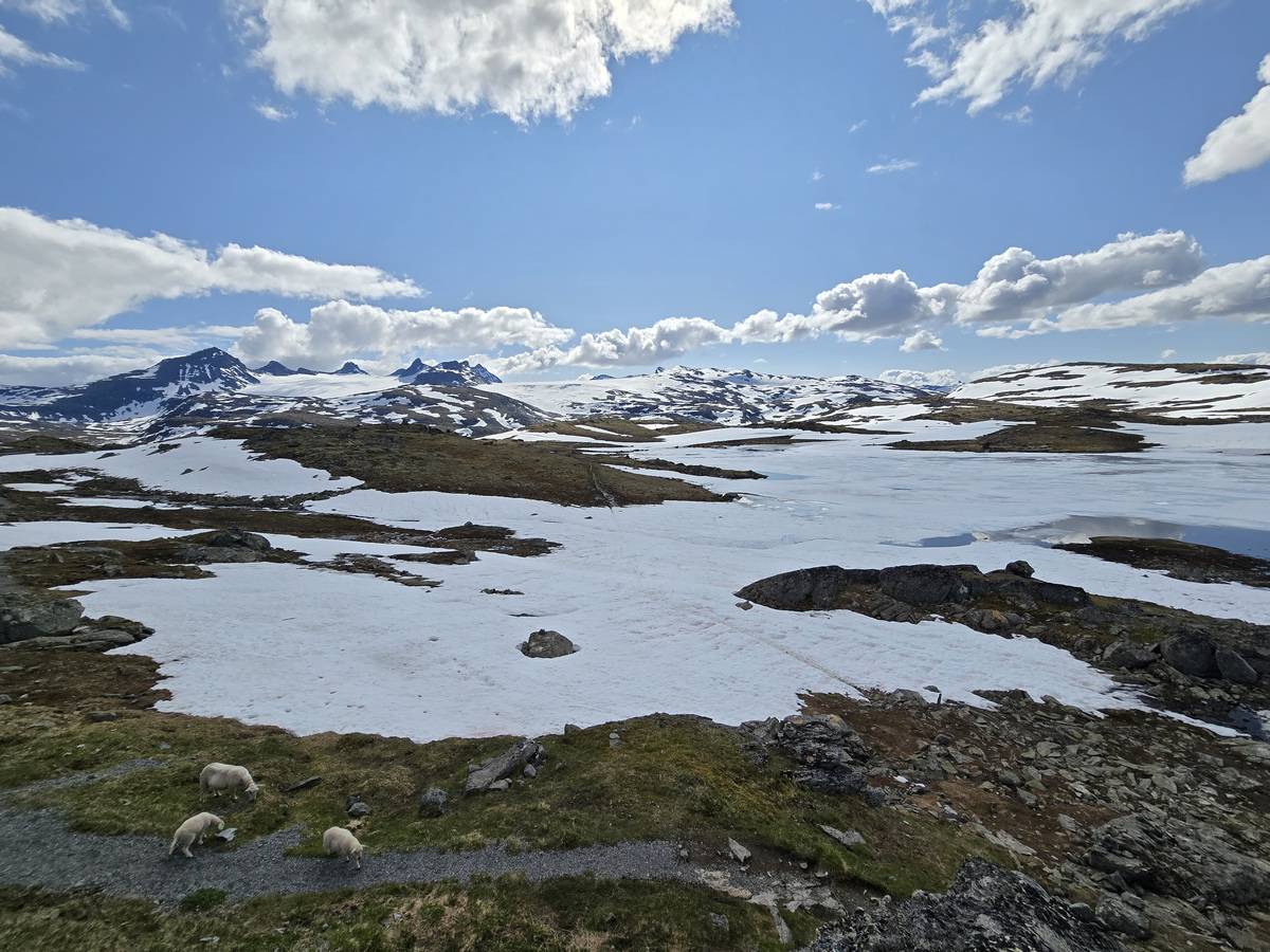 Quelques photos sur la route de Solvorn. Nous sommes sur un haut plateau d'environ 1200m d'altitude et nous cotoyons la neige. Comme partout en Norvège, nous pouvons y admirer les cascades toutes différentes et toutes plus belles les unes que les autres. Nous dormirons après Solvorn sur une aire de stationnement (Coordonnées : 61.283616, 7.164119)