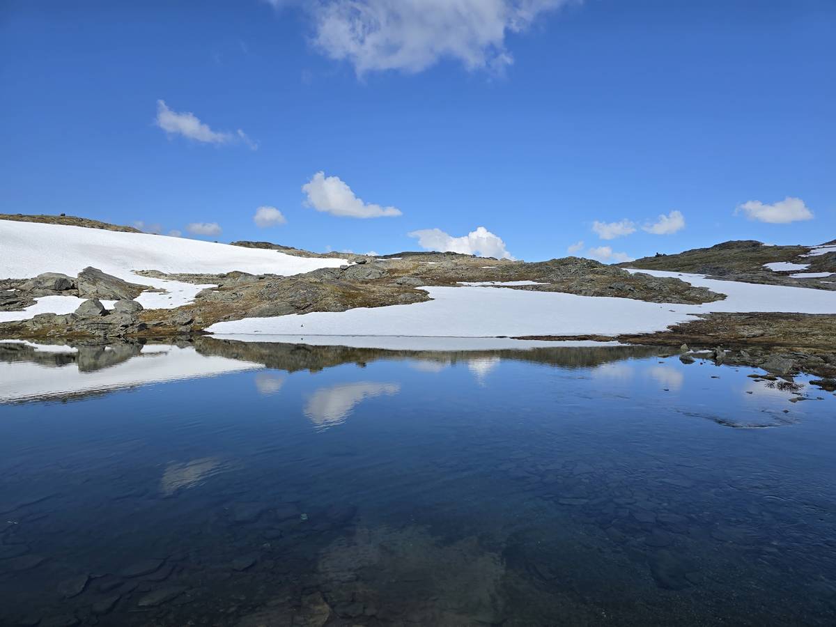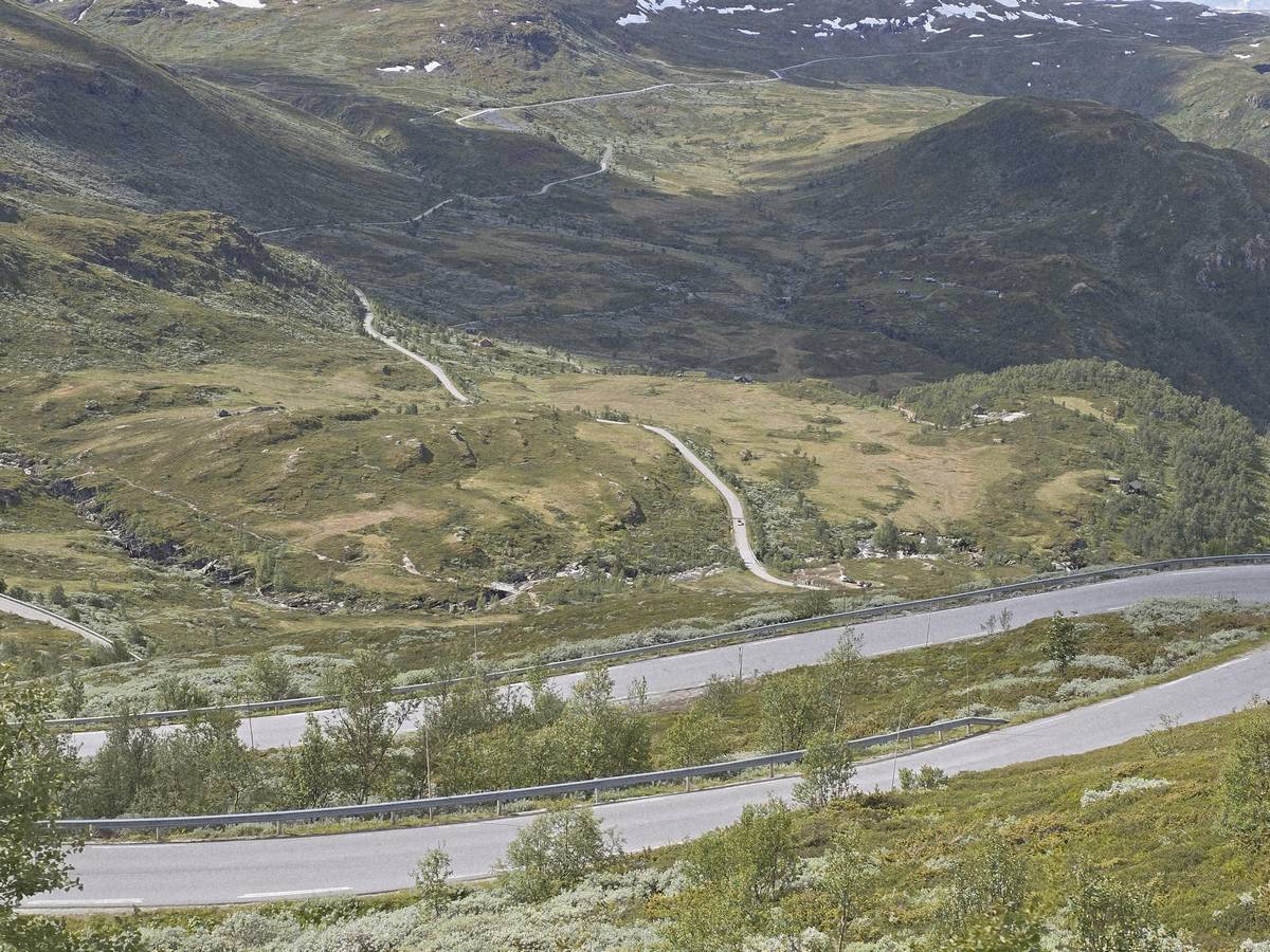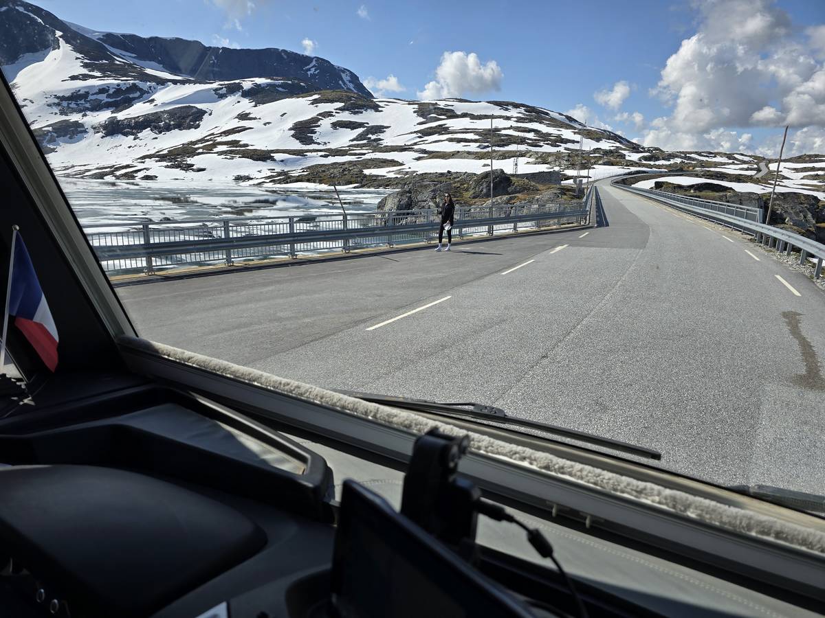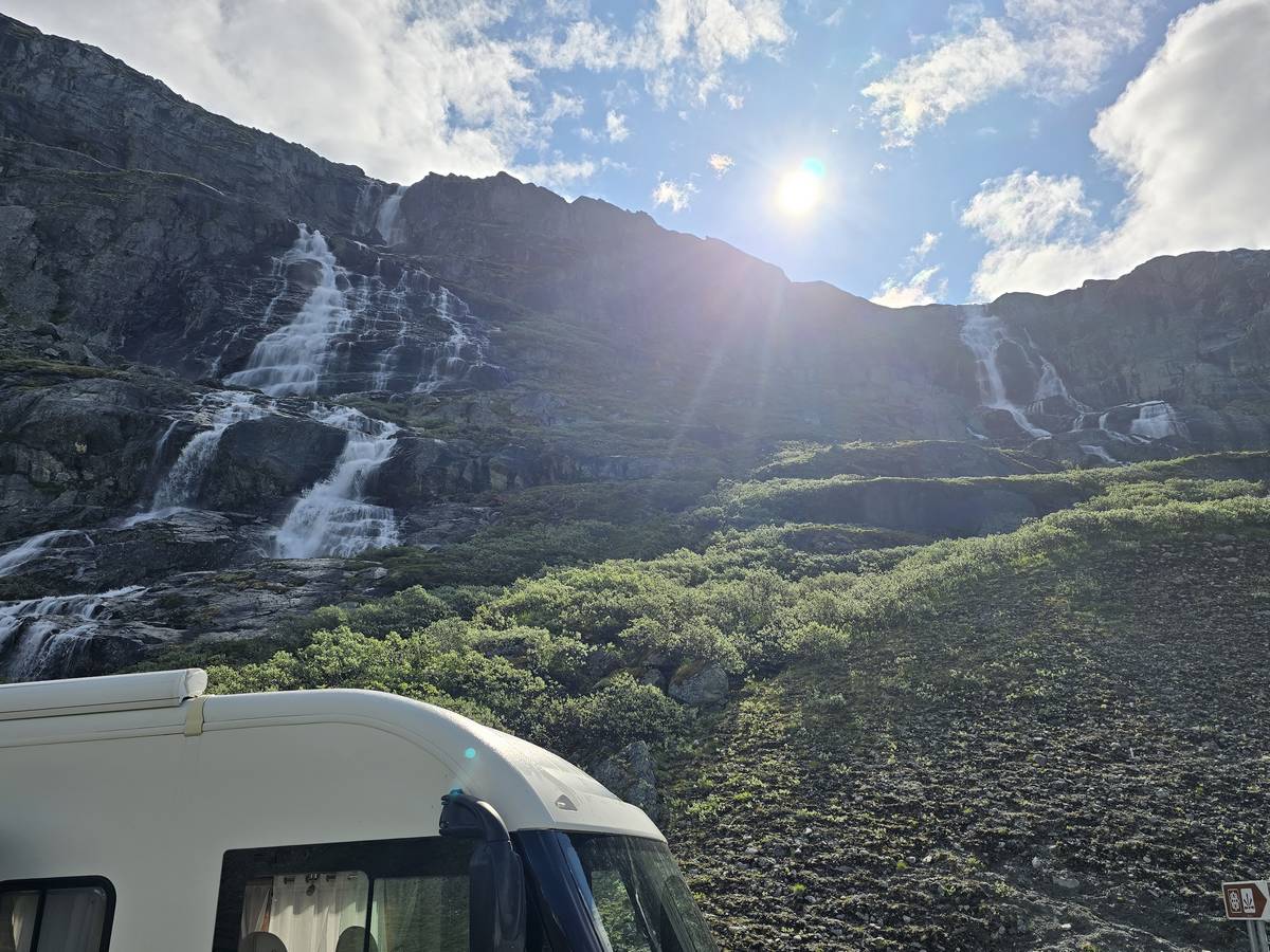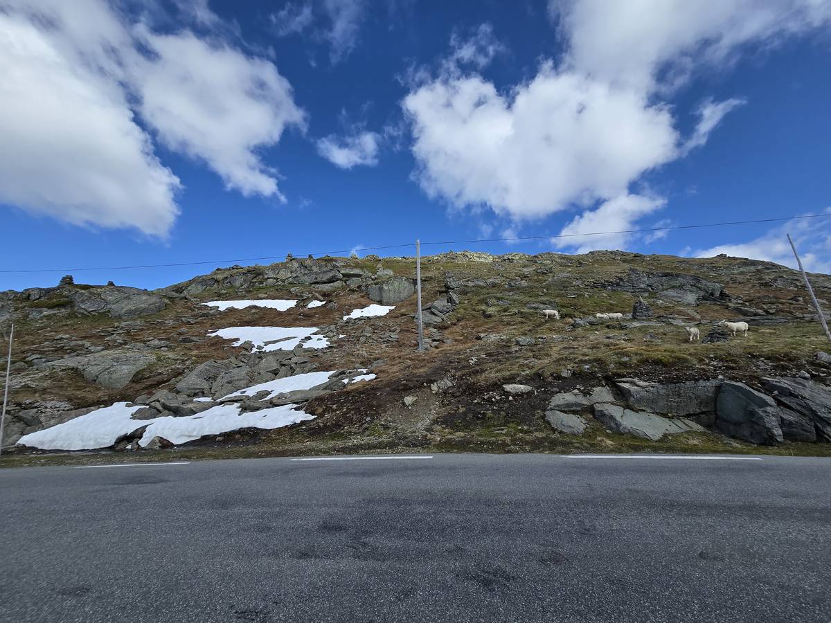 Quelques photos sur la route de Solvorn. Nous sommes sur un haut plateau d'environ 1200m d'altitude et nous cotoyons la neige. Comme partout en Norvège, nous pouvons y admirer les cascades toutes différentes et toutes plus belles les unes que les autres. Nous dormirons après Solvorn sur une aire de stationnement (Coordonnées : 61.283616, 7.164119)