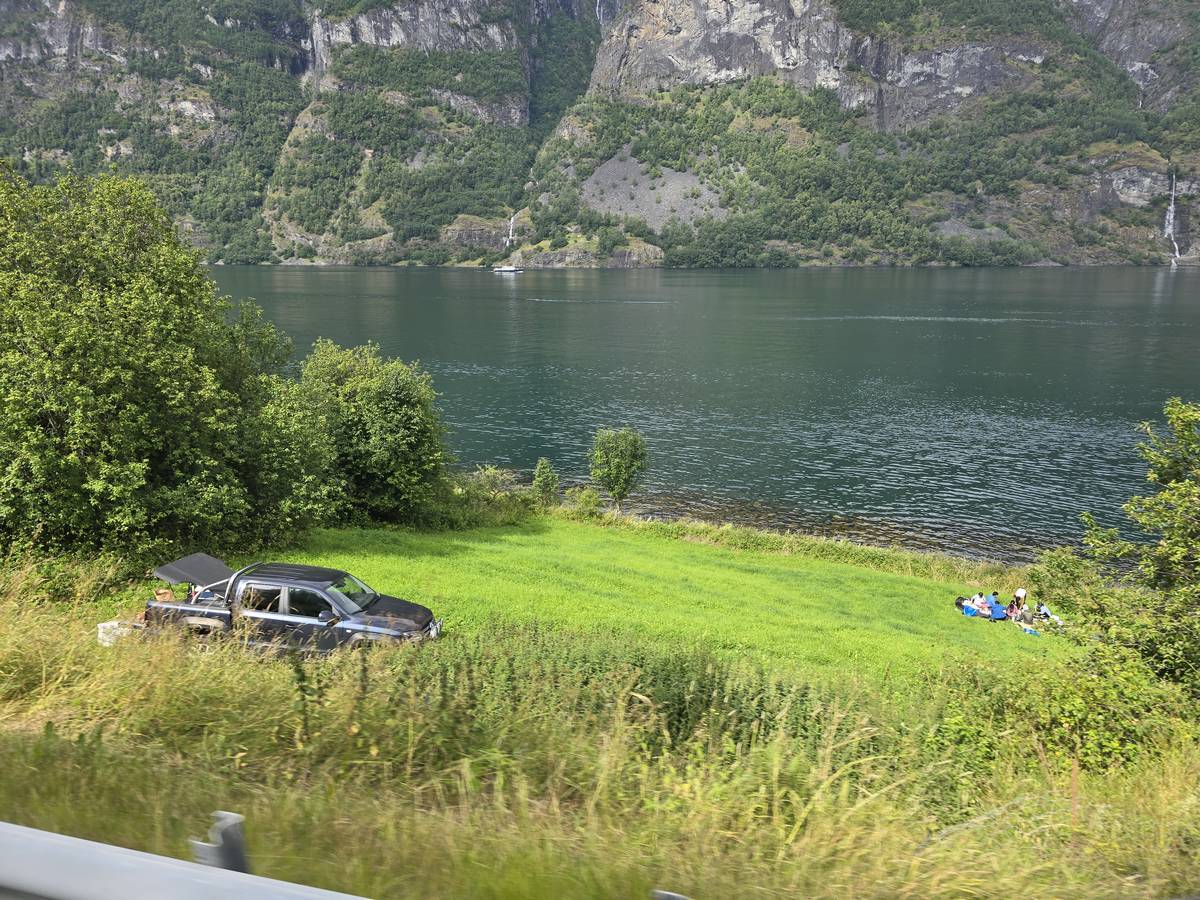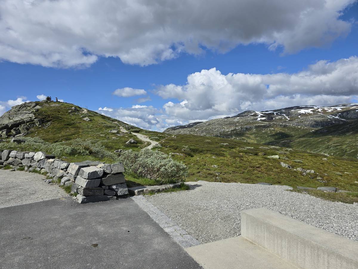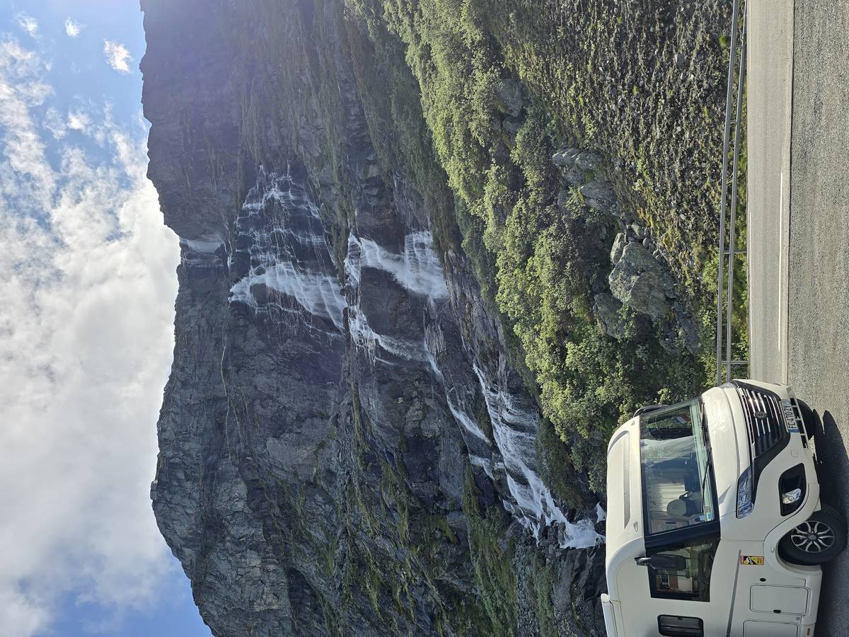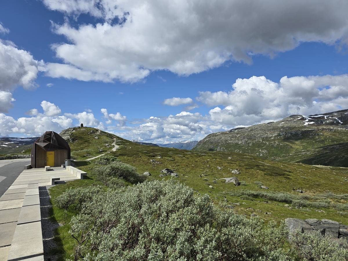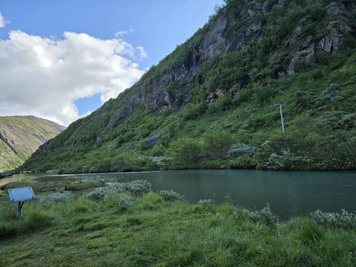 Quelques photos sur la route de Solvorn. Nous sommes sur un haut plateau d'environ 1200m d'altitude et nous cotoyons la neige. Comme partout en Norvège, nous pouvons y admirer les cascades toutes différentes et toutes plus belles les unes que les autres. Nous dormirons après Solvorn sur une aire de stationnement (Coordonnées : 61.283616, 7.164119)