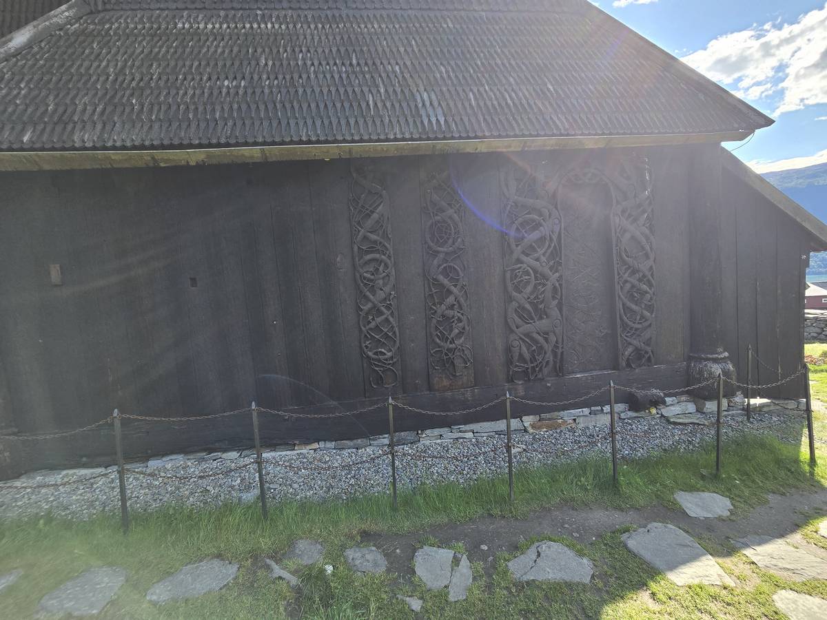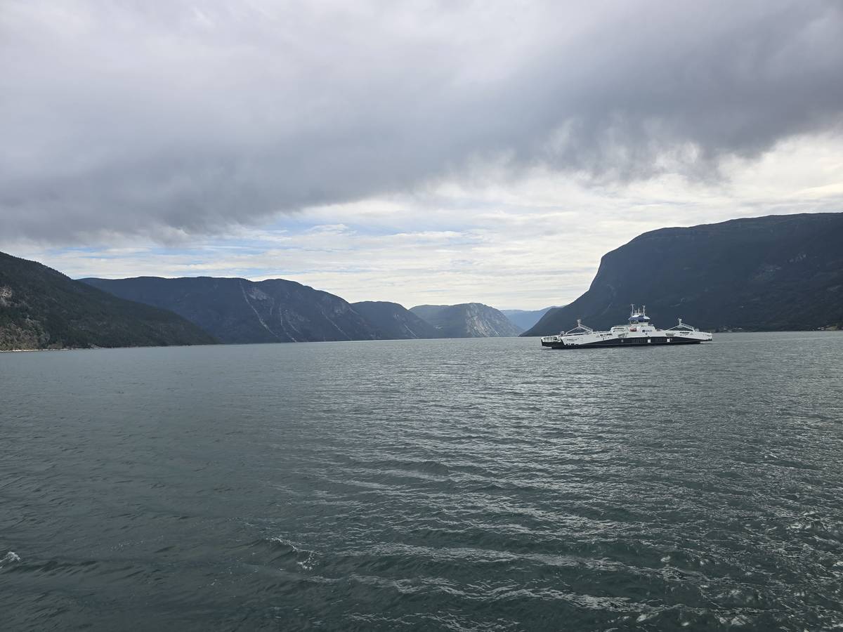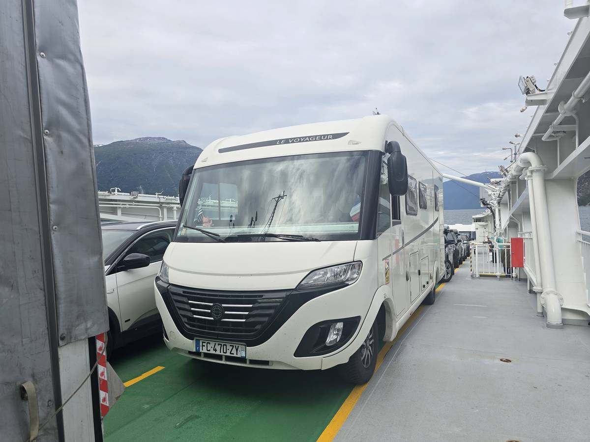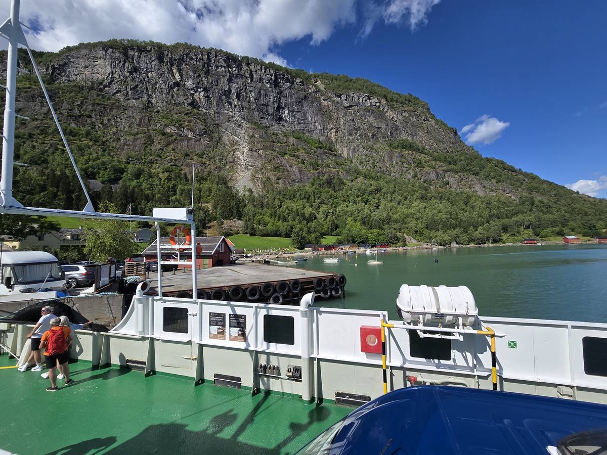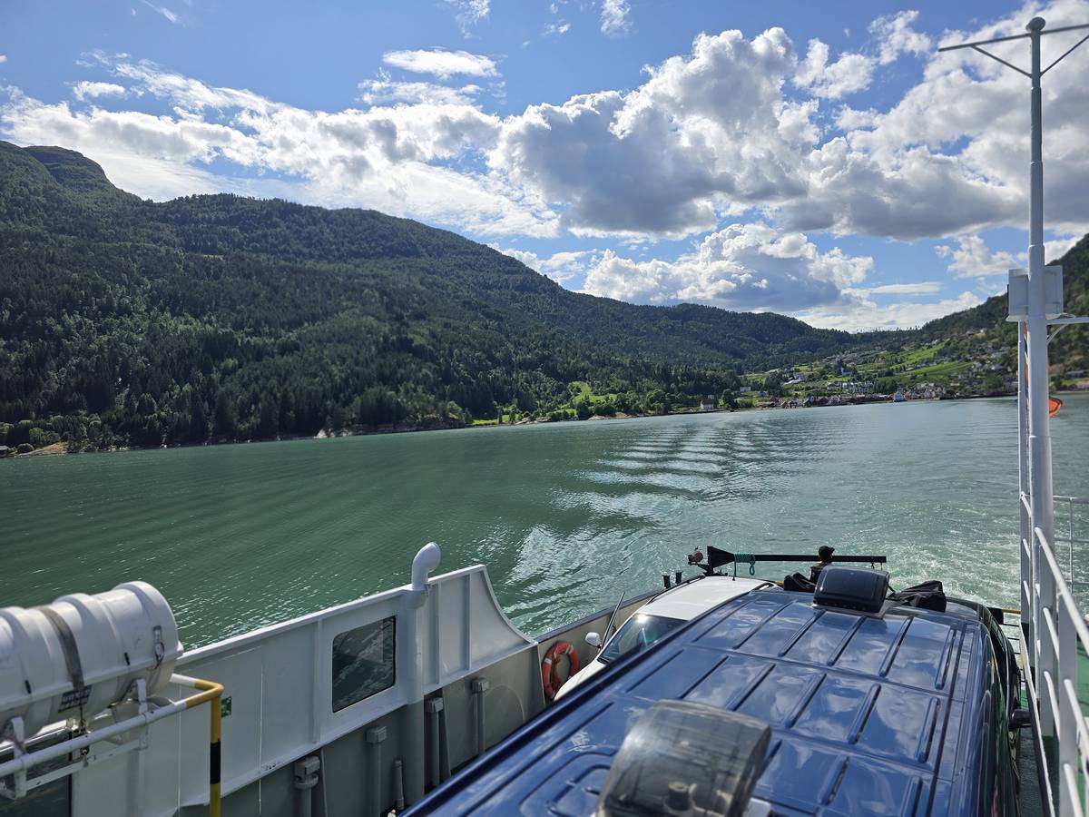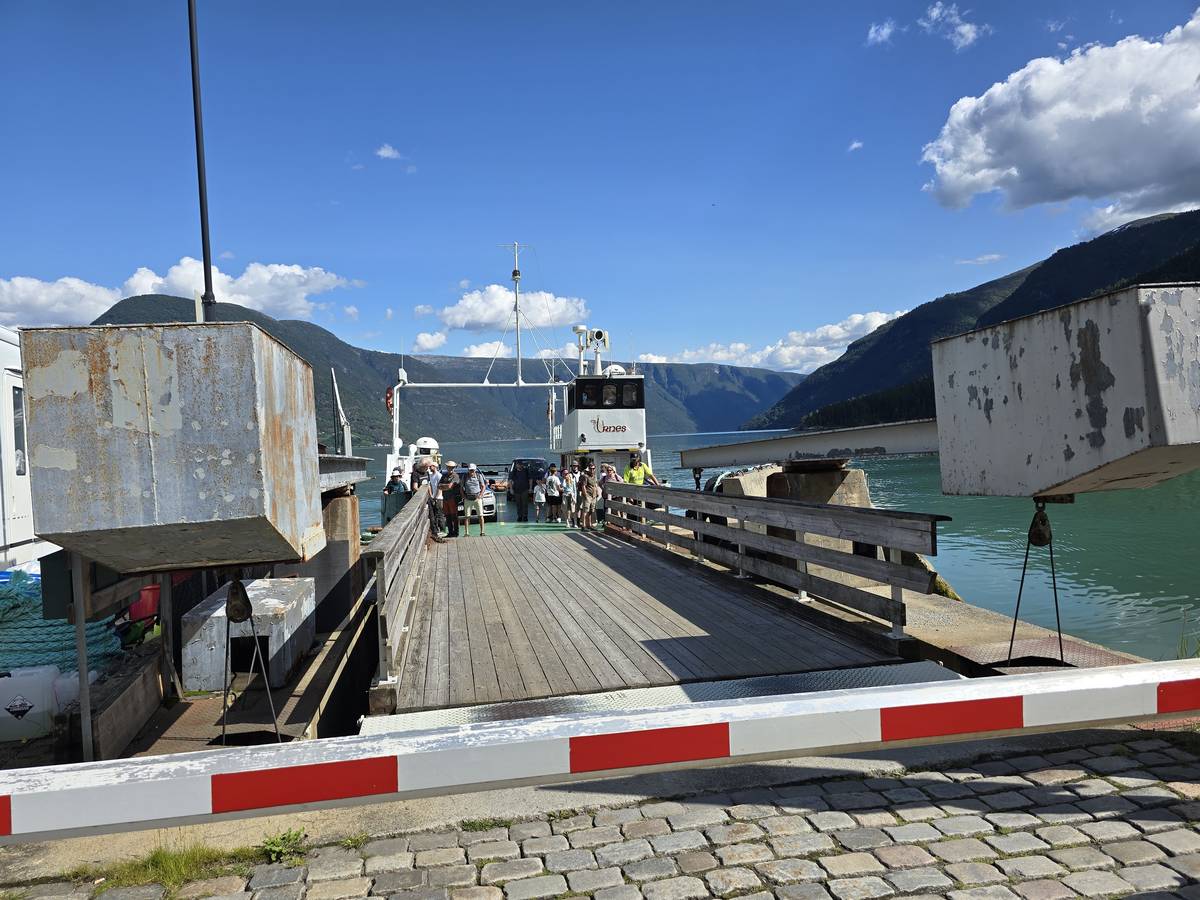 Arrivés à Solvorn, nous posons le camping-car sur le parking près de l'église puis nous prenons le ferry, à pied, pour aller en face à Ornes voir l'église en bois debout d'Urnes. Pour les vicieux qui pensent qu'on aurait pu y aller à la nage, je répondrais qu'on y a pensé, mais l'eau était vraiment froide!!!