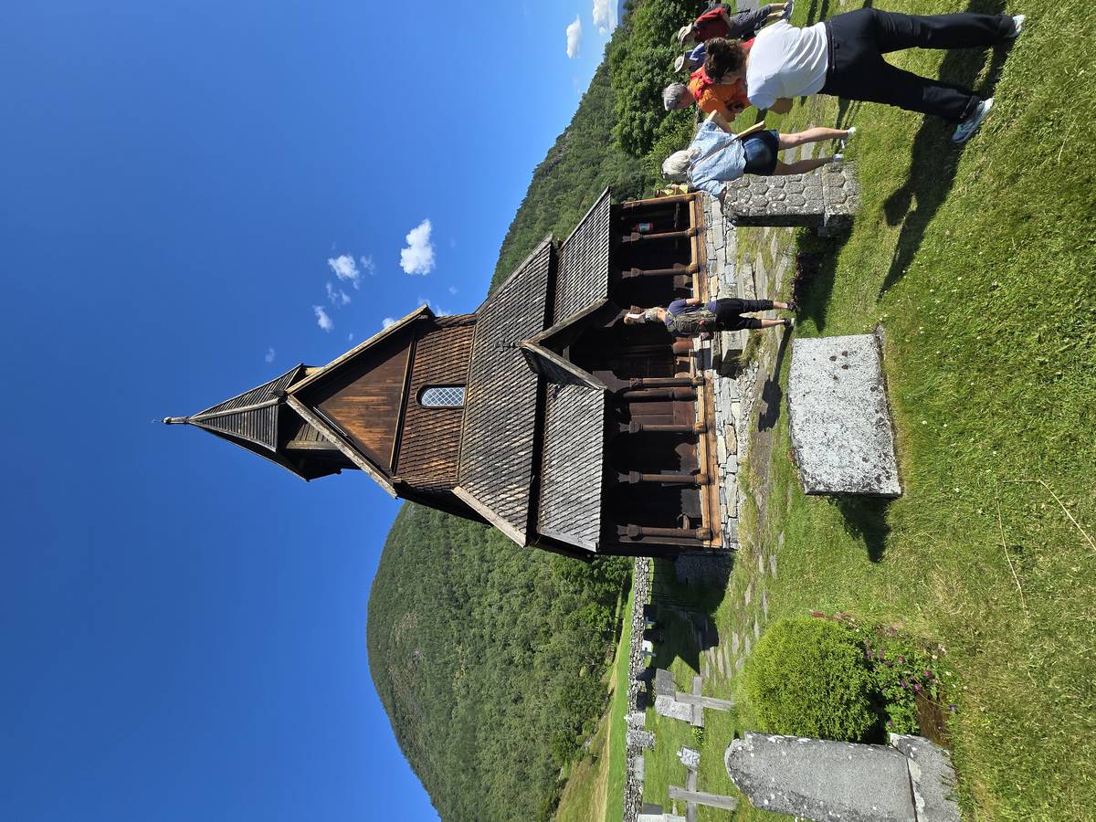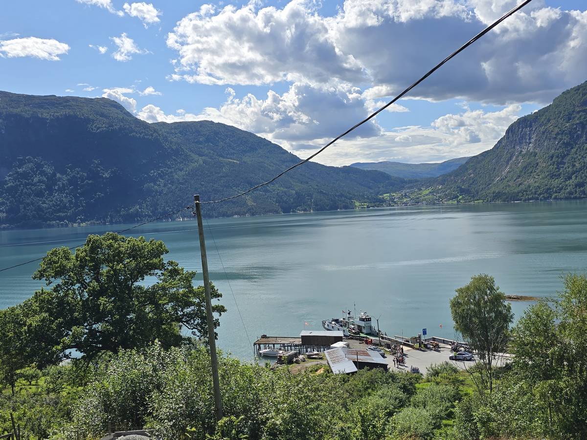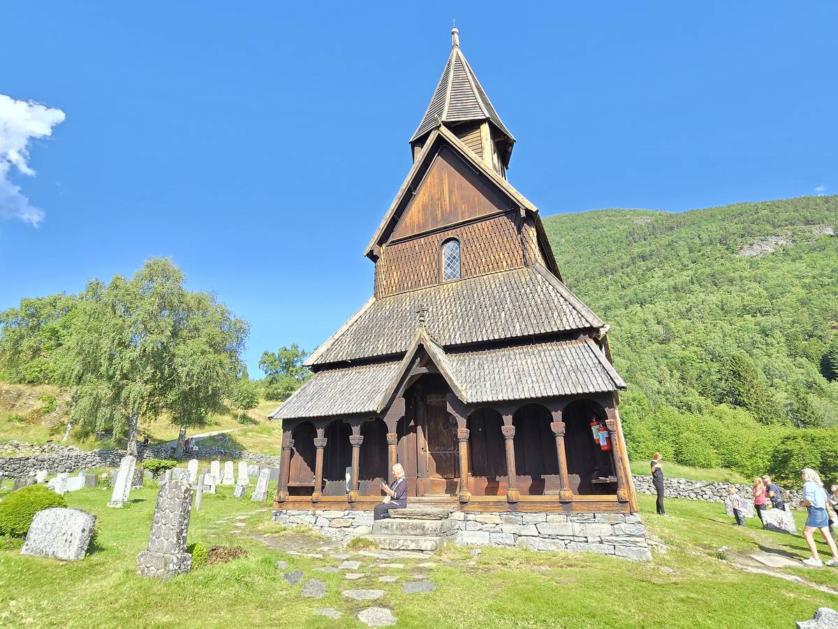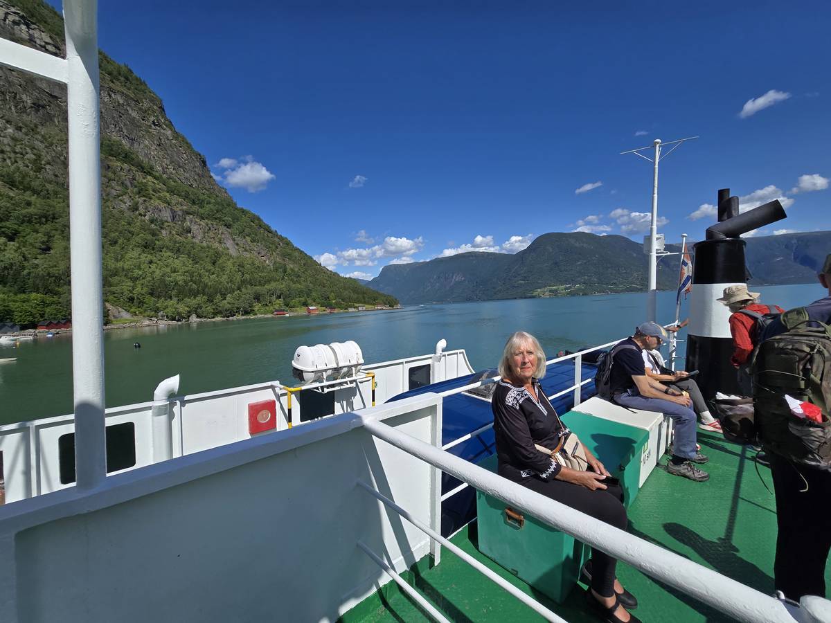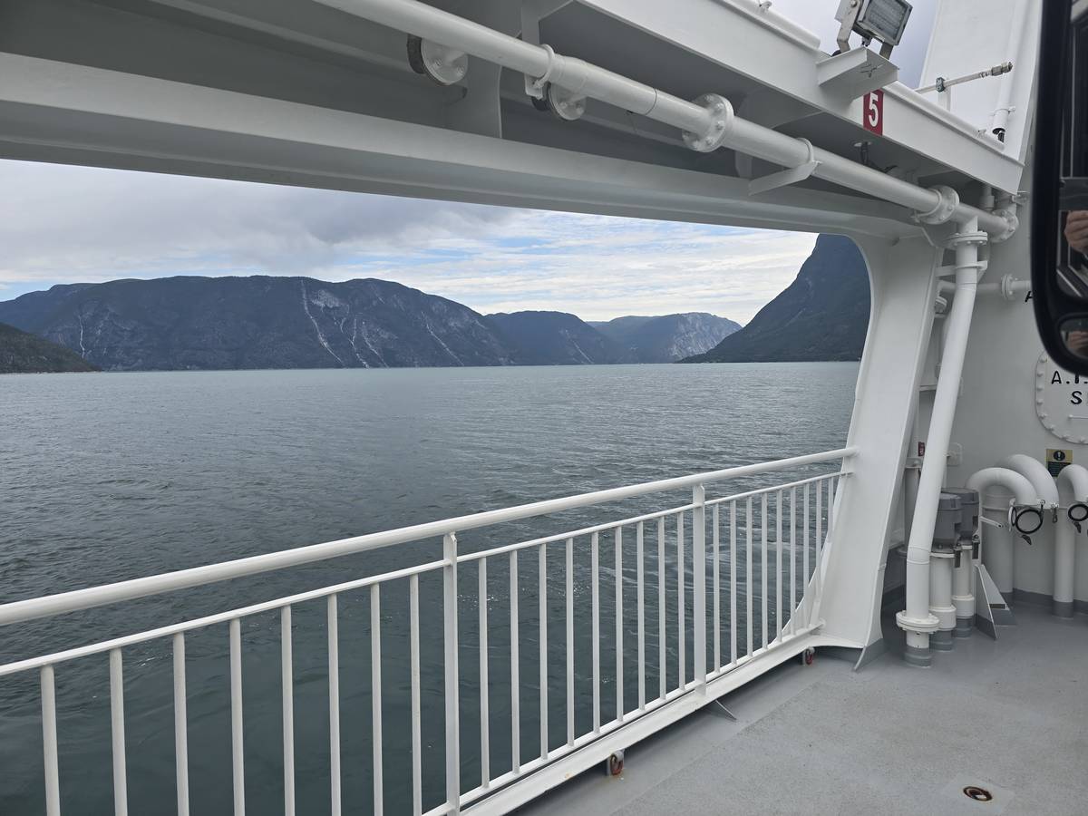 Arrivés à Solvorn, nous posons le camping-car sur le parking près de l'église puis nous prenons le ferry, à pied, pour aller en face à Ornes voir l'église en bois debout d'Urnes. Pour les vicieux qui pensent qu'on aurait pu y aller à la nage, je répondrais qu'on y a pensé, mais l'eau était vraiment froide!!!