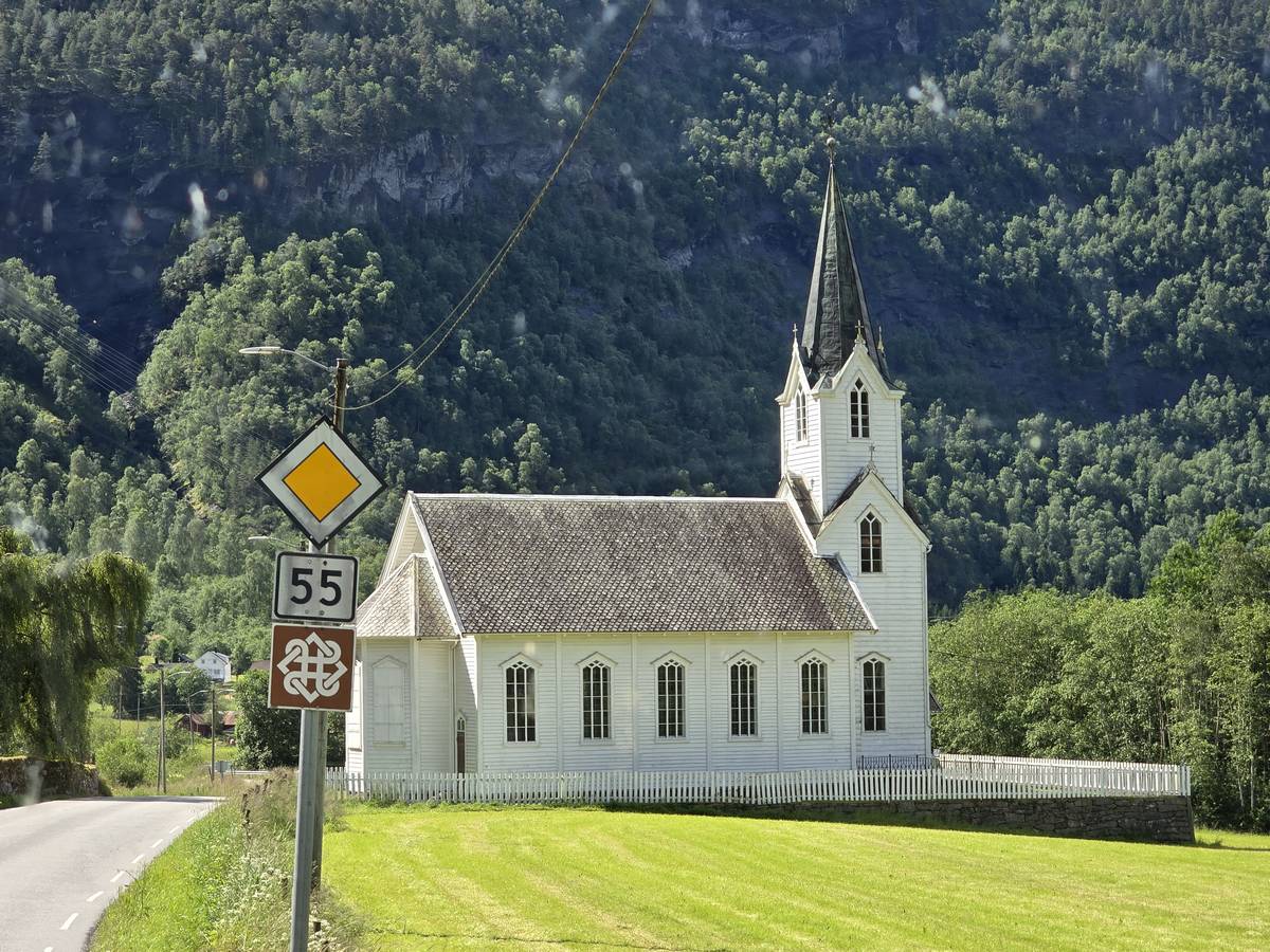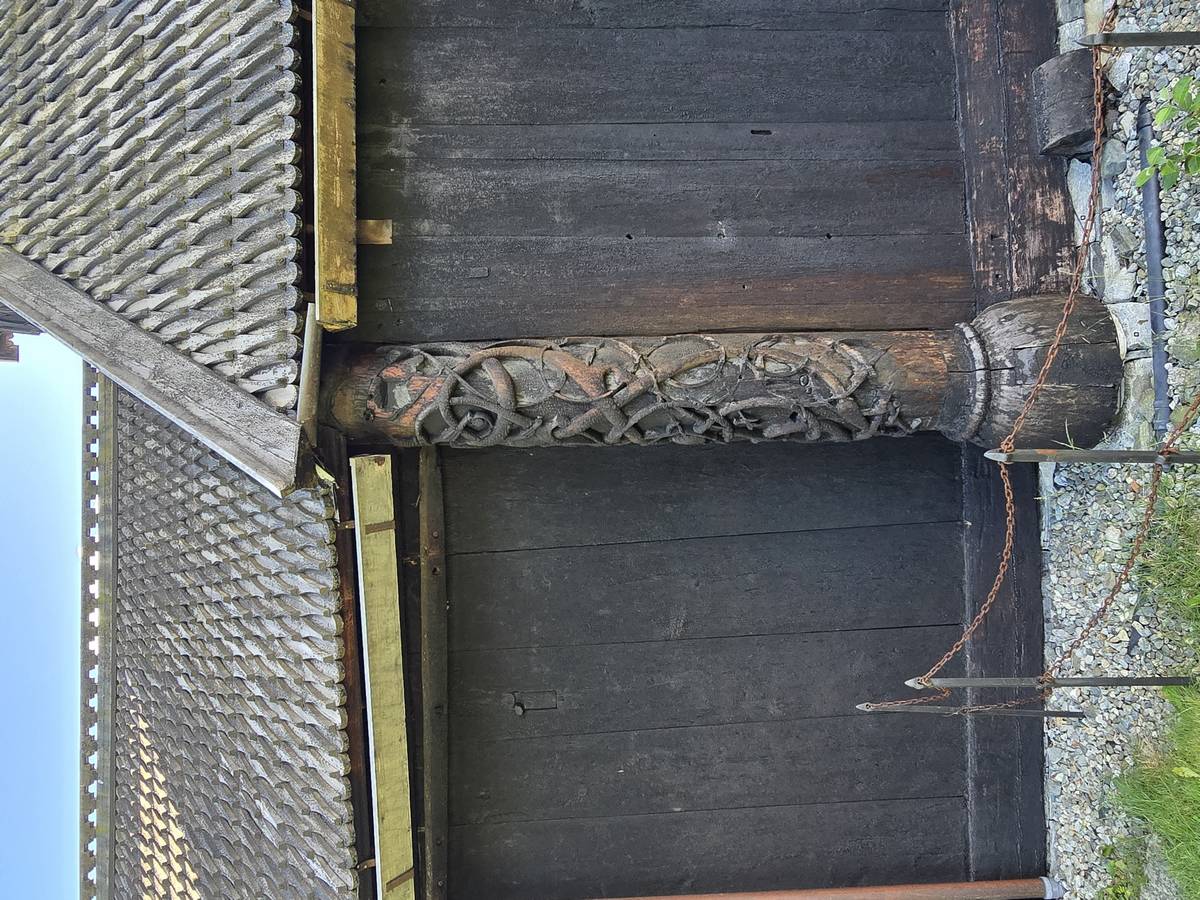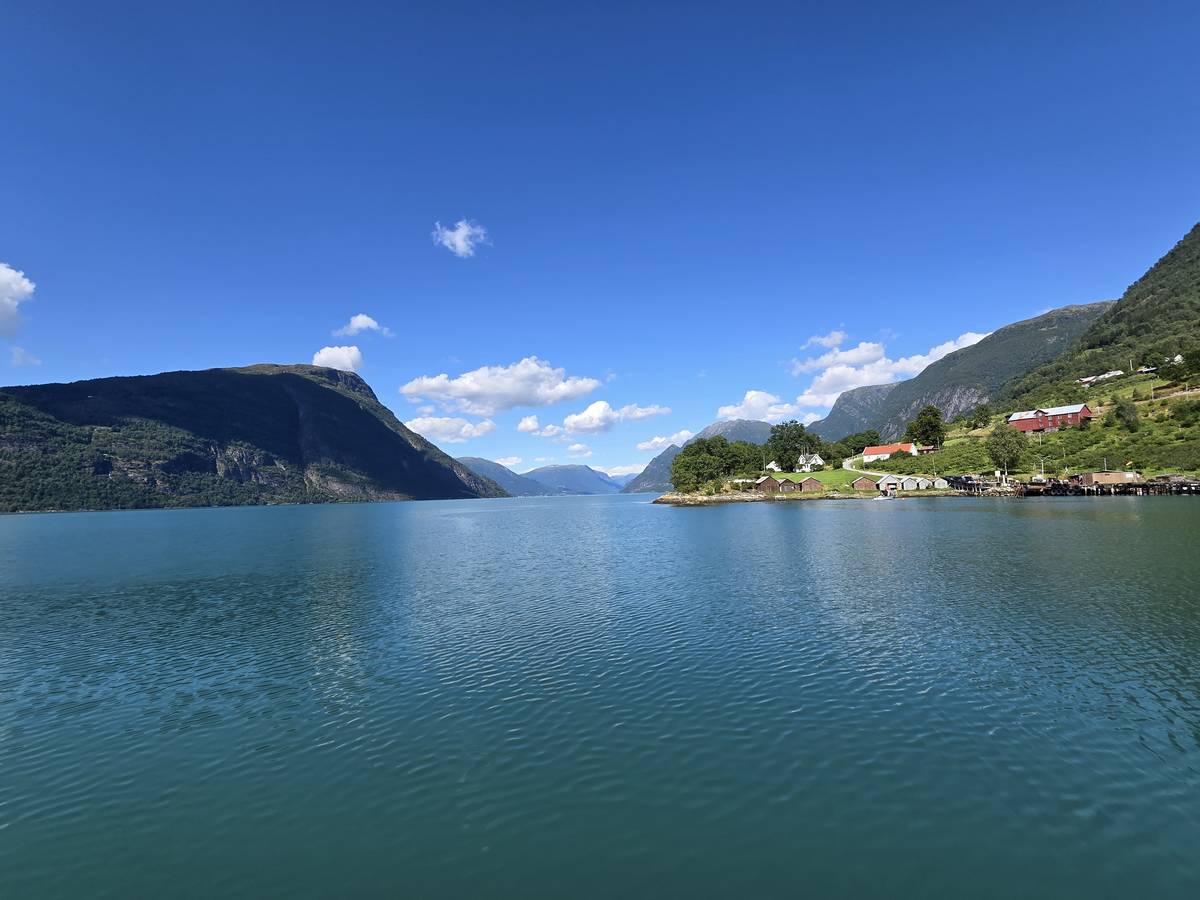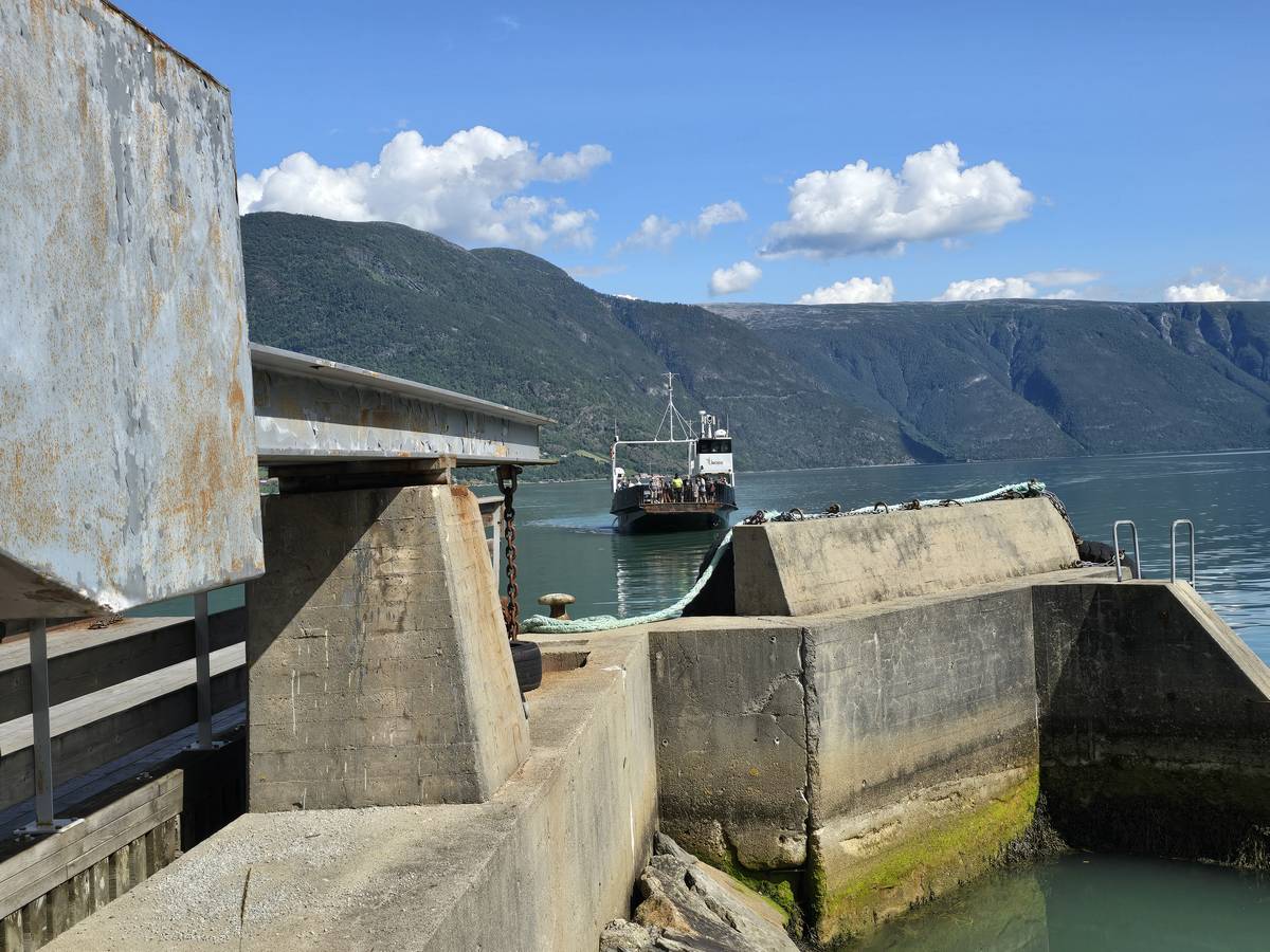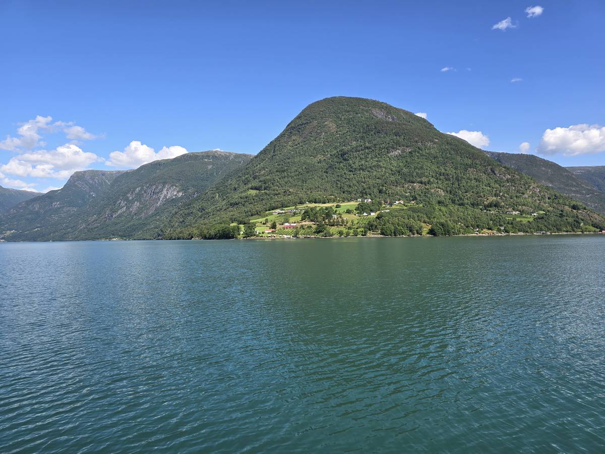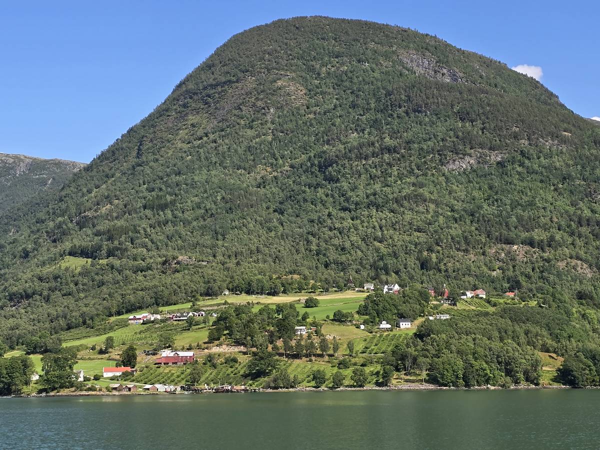 Arrivés à Solvorn, nous posons le camping-car sur le parking près de l'église puis nous prenons le ferry, à pied, pour aller en face à Ornes voir l'église en bois debout d'Urnes. Pour les vicieux qui pensent qu'on aurait pu y aller à la nage, je répondrais qu'on y a pensé, mais l'eau était vraiment froide!!!