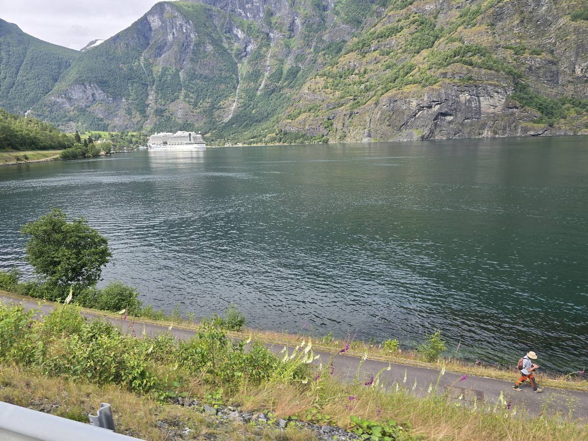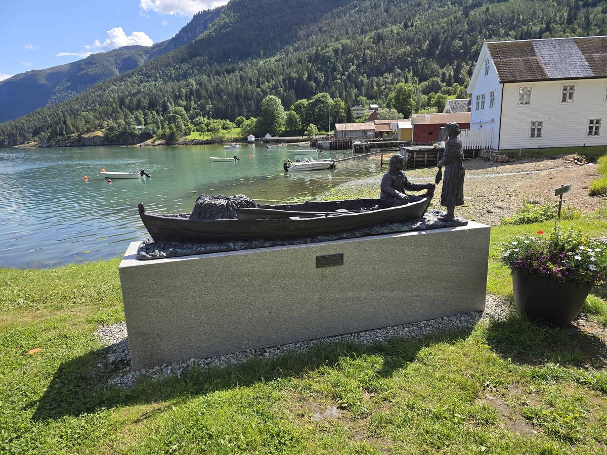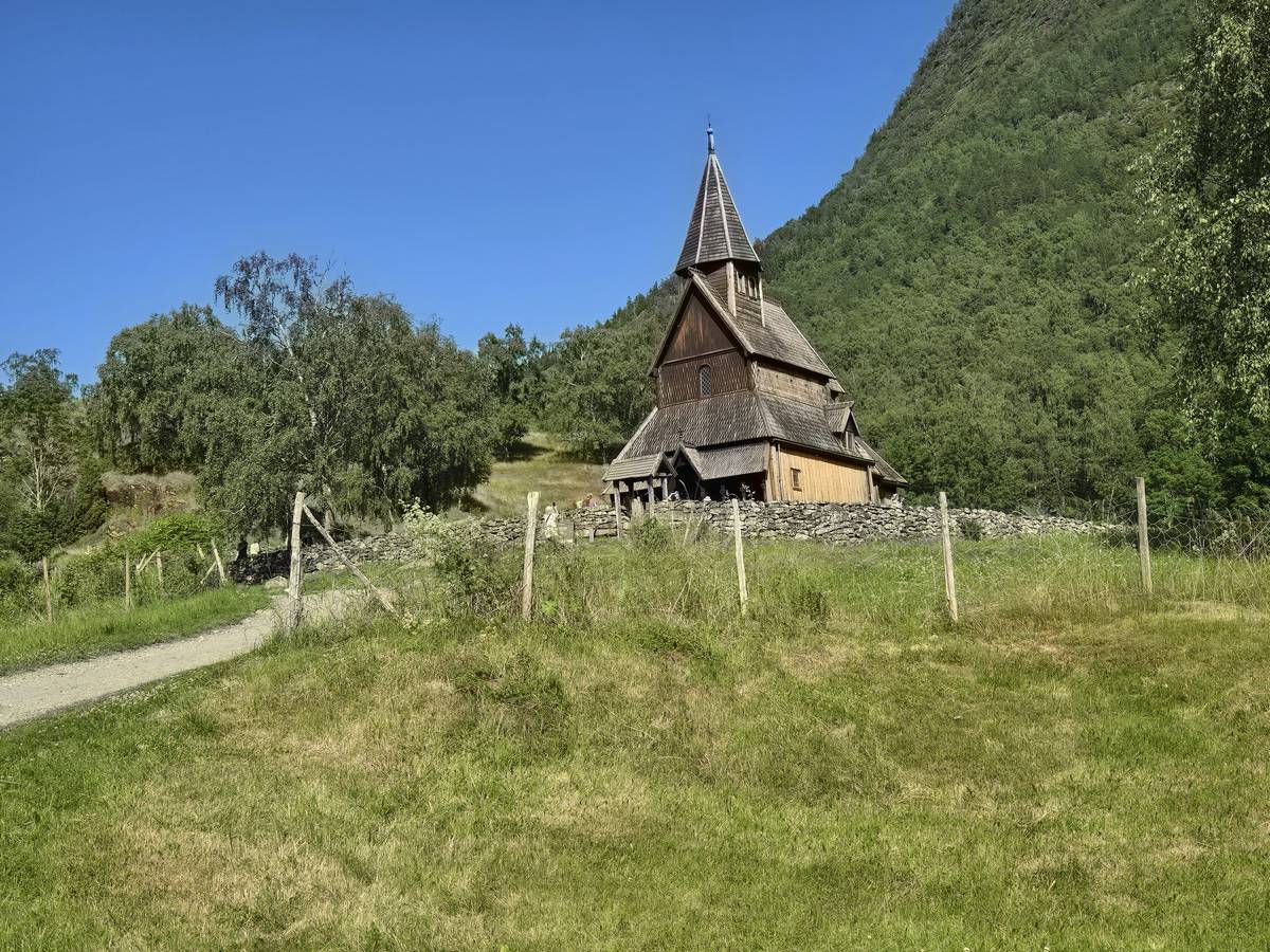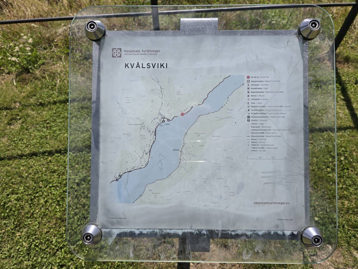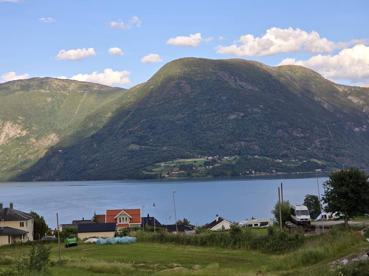 Arrivés à Solvorn, nous posons le camping-car sur le parking près de l'église puis nous prenons le ferry, à pied, pour aller en face à Ornes voir l'église en bois debout d'Urnes. Pour les vicieux qui pensent qu'on aurait pu y aller à la nage, je répondrais qu'on y a pensé, mais l'eau était vraiment froide!!!