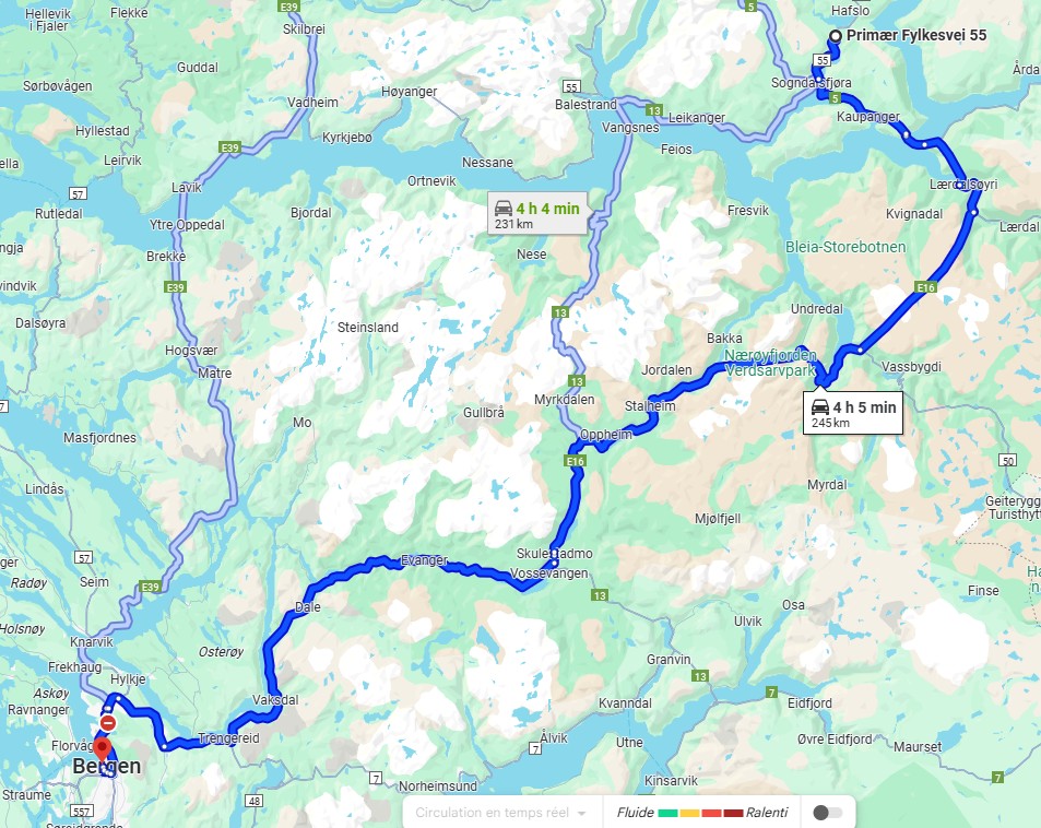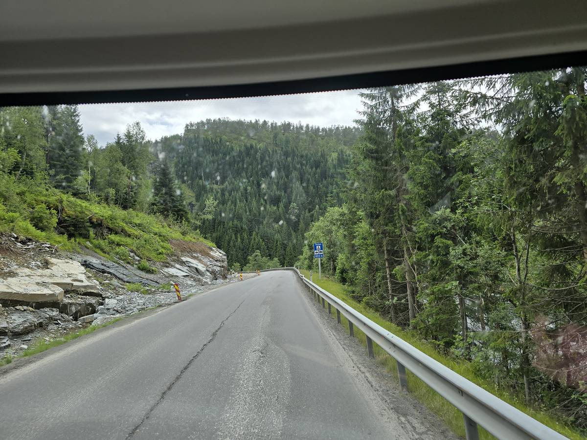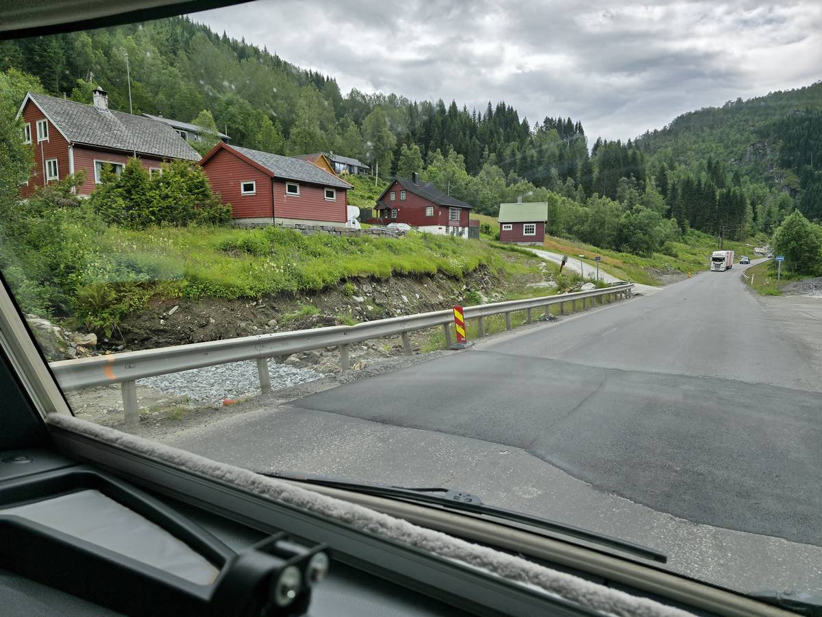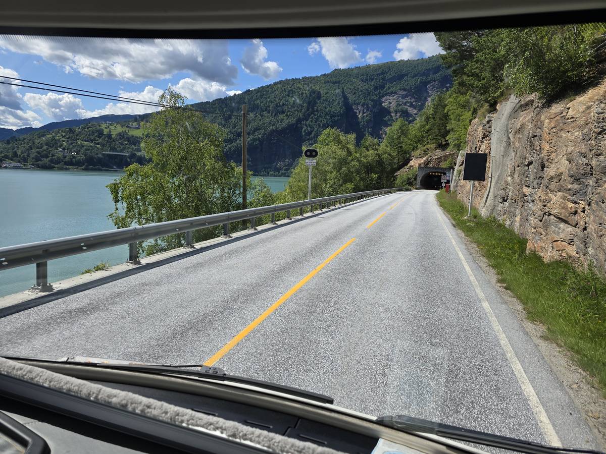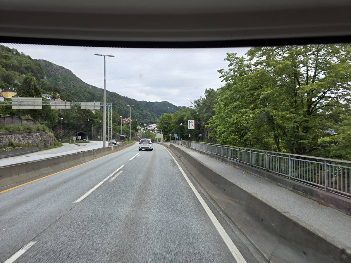 Nous nous rendons à Bergen par la route E16. Beaucoup de tunnels dont un de 24 kilomètres et un de 11,6 kilomètres plus, beaucoup de moindre importance. Nous dormirons à Bergen sur le port. (Coordonnées : 60.392034, 5.312786)
