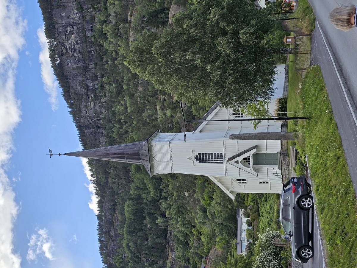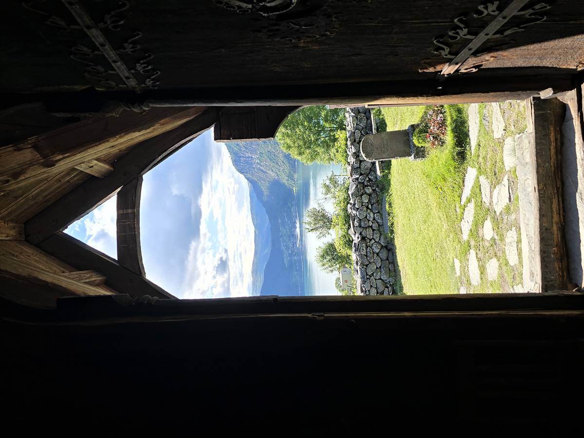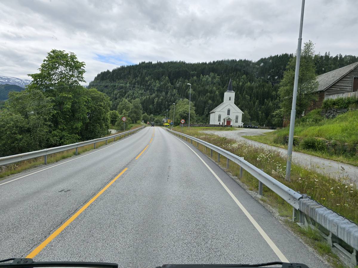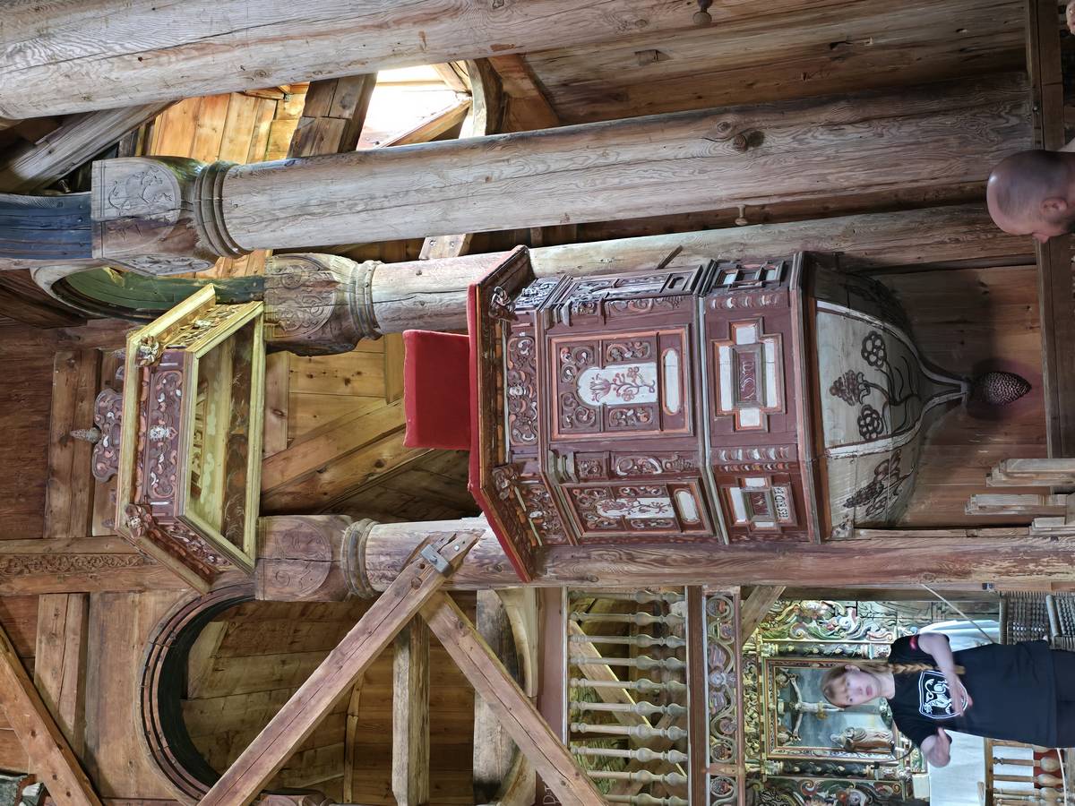 Arrivés à Ornes, ce n'est pas fini, il faut grimper environ 20 minutes, par une petite route en lacets jusqu'à l'église en bois debout qui mérite cette ascension. Vous me croirez si vous voulez, mais la descente a été plus agréable... De plus, nous avons eu un beau temps... Il s'est mis à pleuvoir soudainement alors que nous venions de rentrer dans le camping-car.