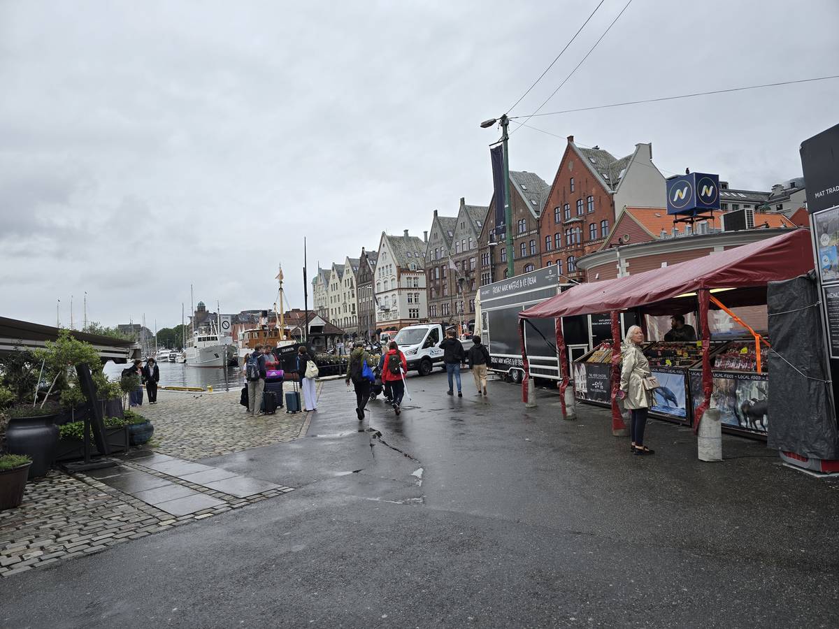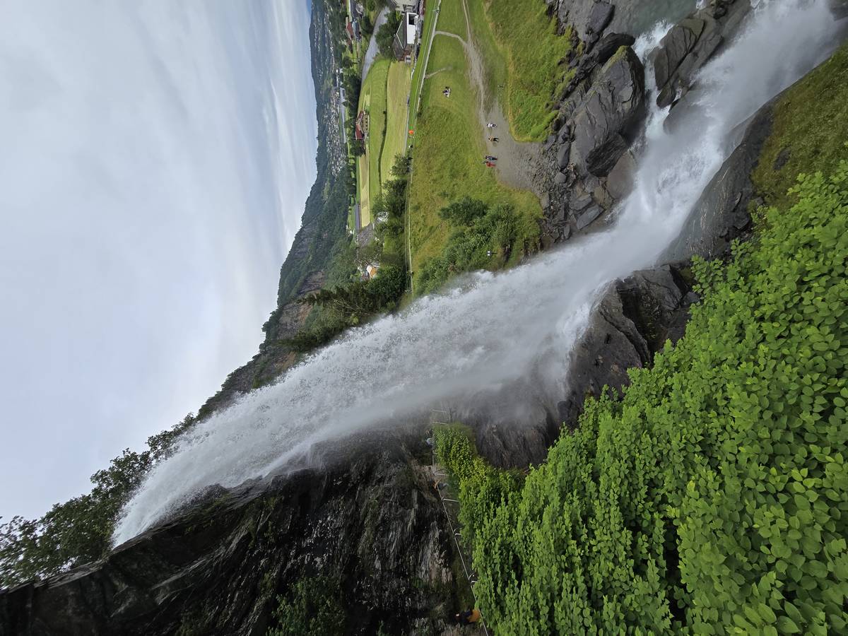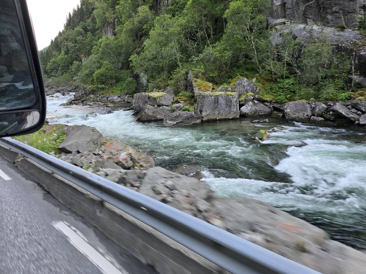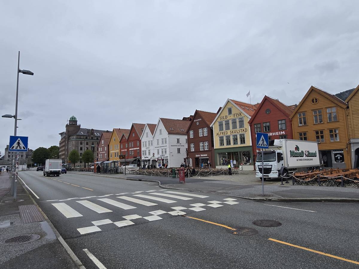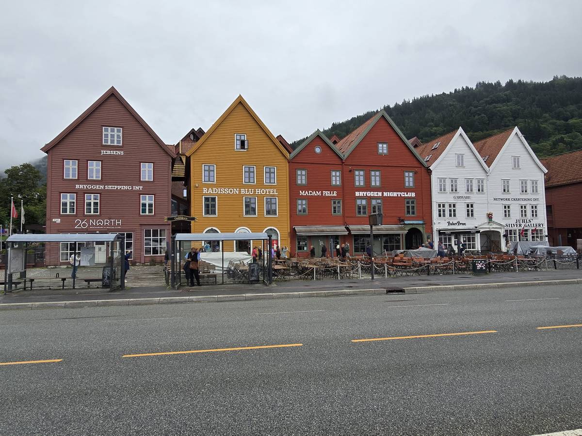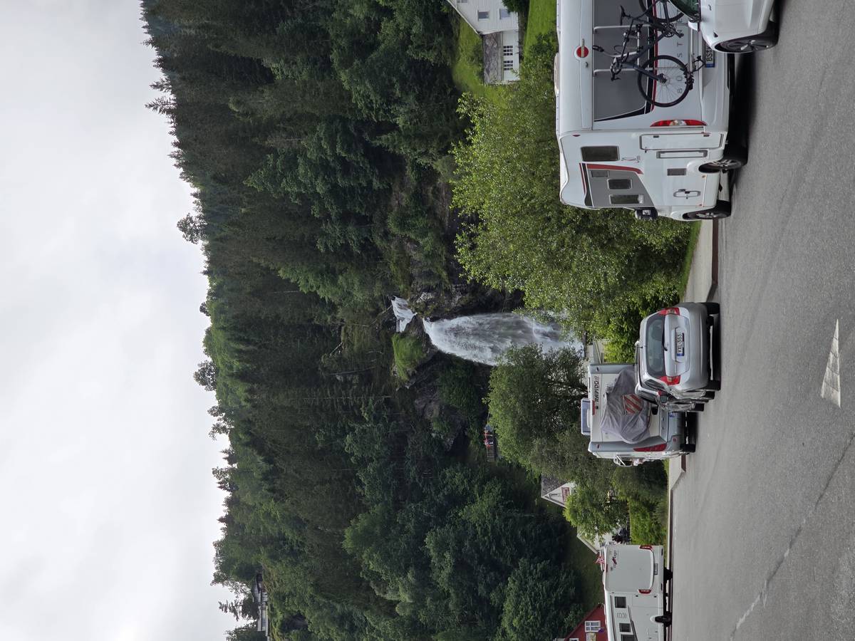 La nuit a été bonne malgré le bruit des moteurs des gros bateaux à touristes. Quand je dis nuit, c'est d'une nuit encore claire dont je parle, nous n'avons pas encore retrouvé une vraie nuit, ce n'est qu'à Jorpeland que nous retrouverons une nuit qu'on pourra appeler nuit. Ce matin, nous retournons faire un tour, cette fois dans le vieux Bergen. Il pleut, mais nous sommes bretons!!! Nous déjeunerons sur le lieu de bivouac, puis nous nous dirigeons vers les cascades jumelles de Latefossen que nous atteindrons le soir. Nous dormons sur le parking des cascades de Latefossen (Coordonnées : 59.948080, 6.583847)
