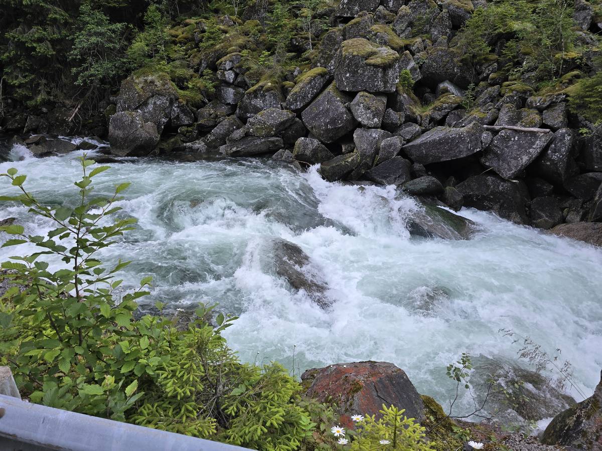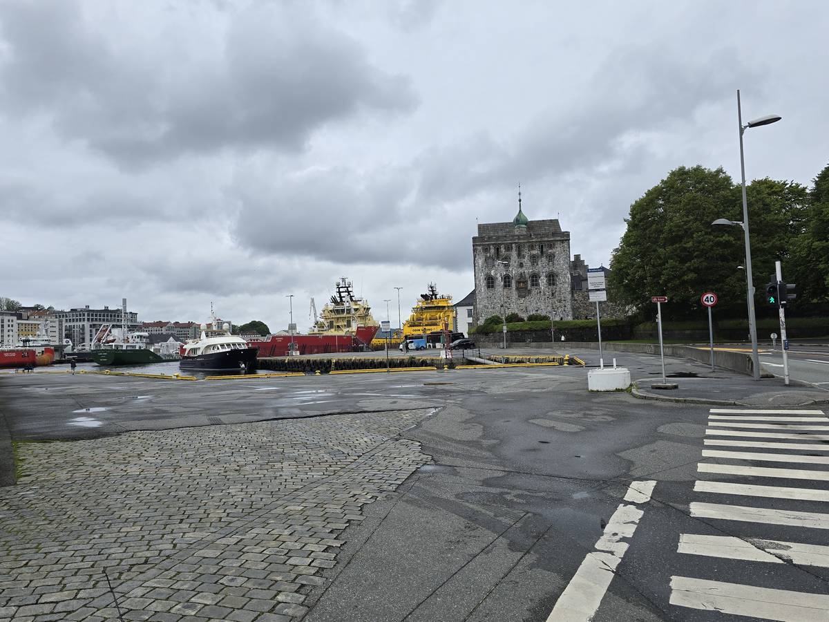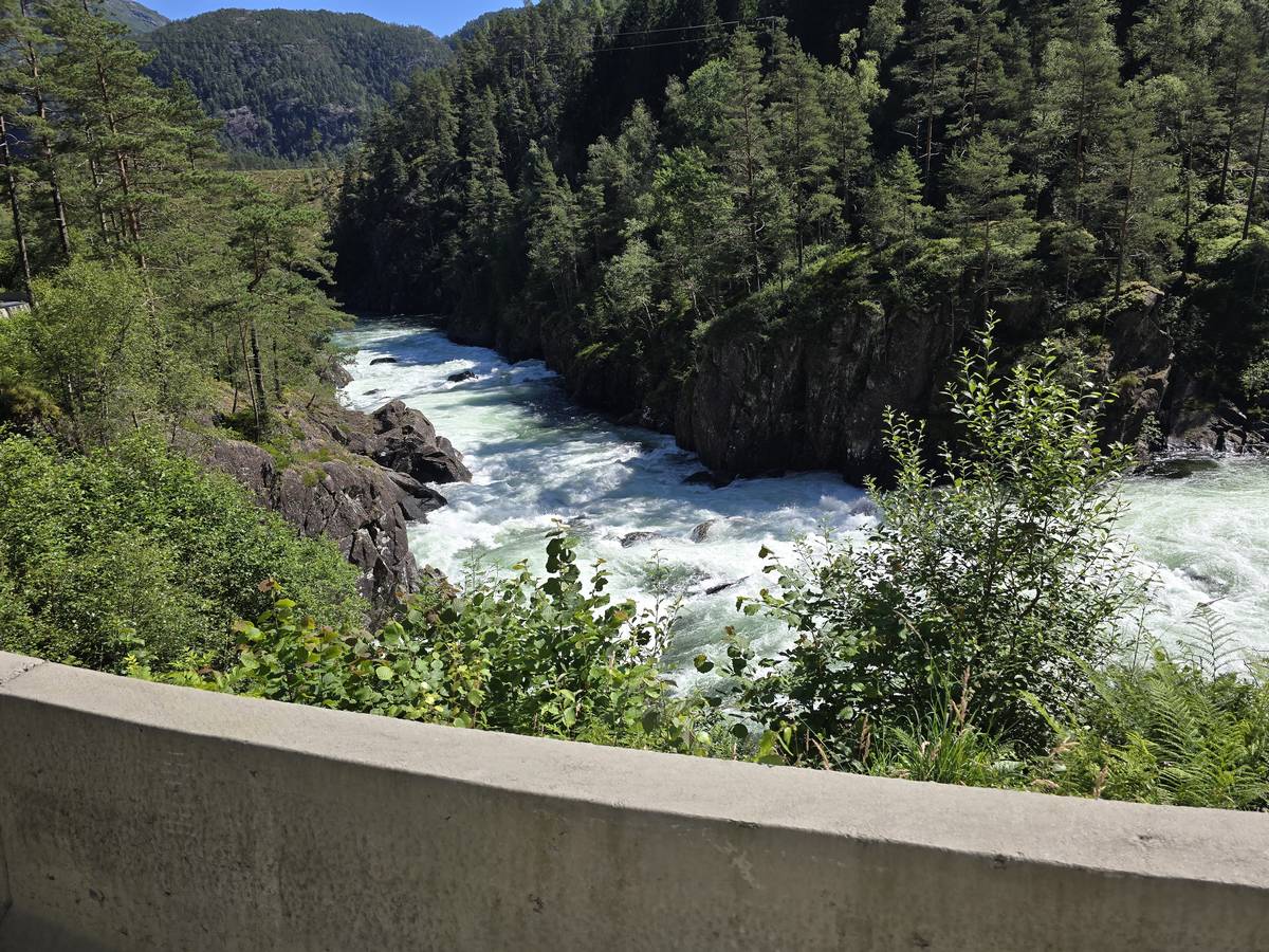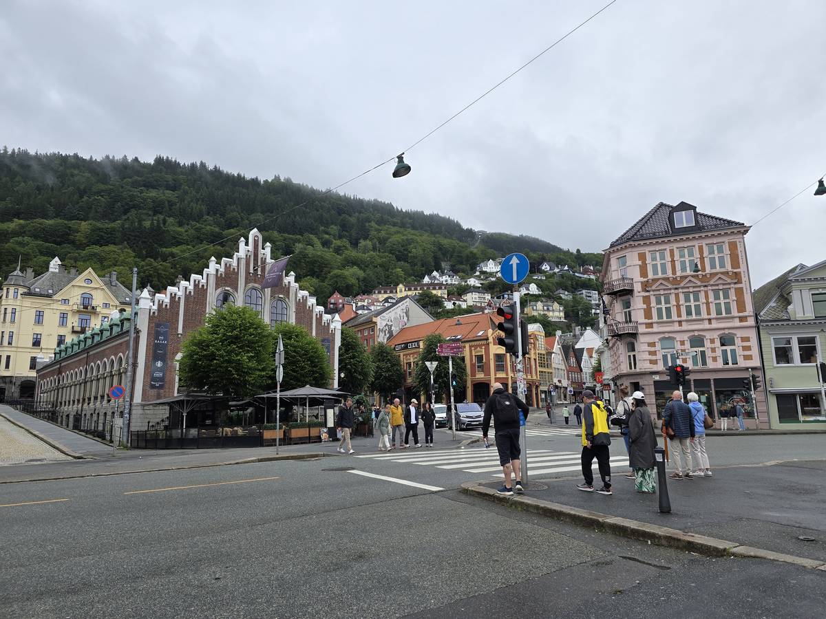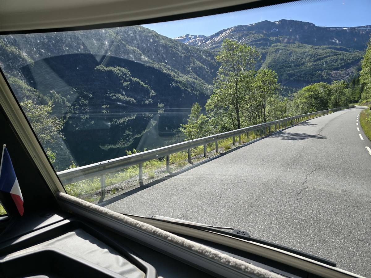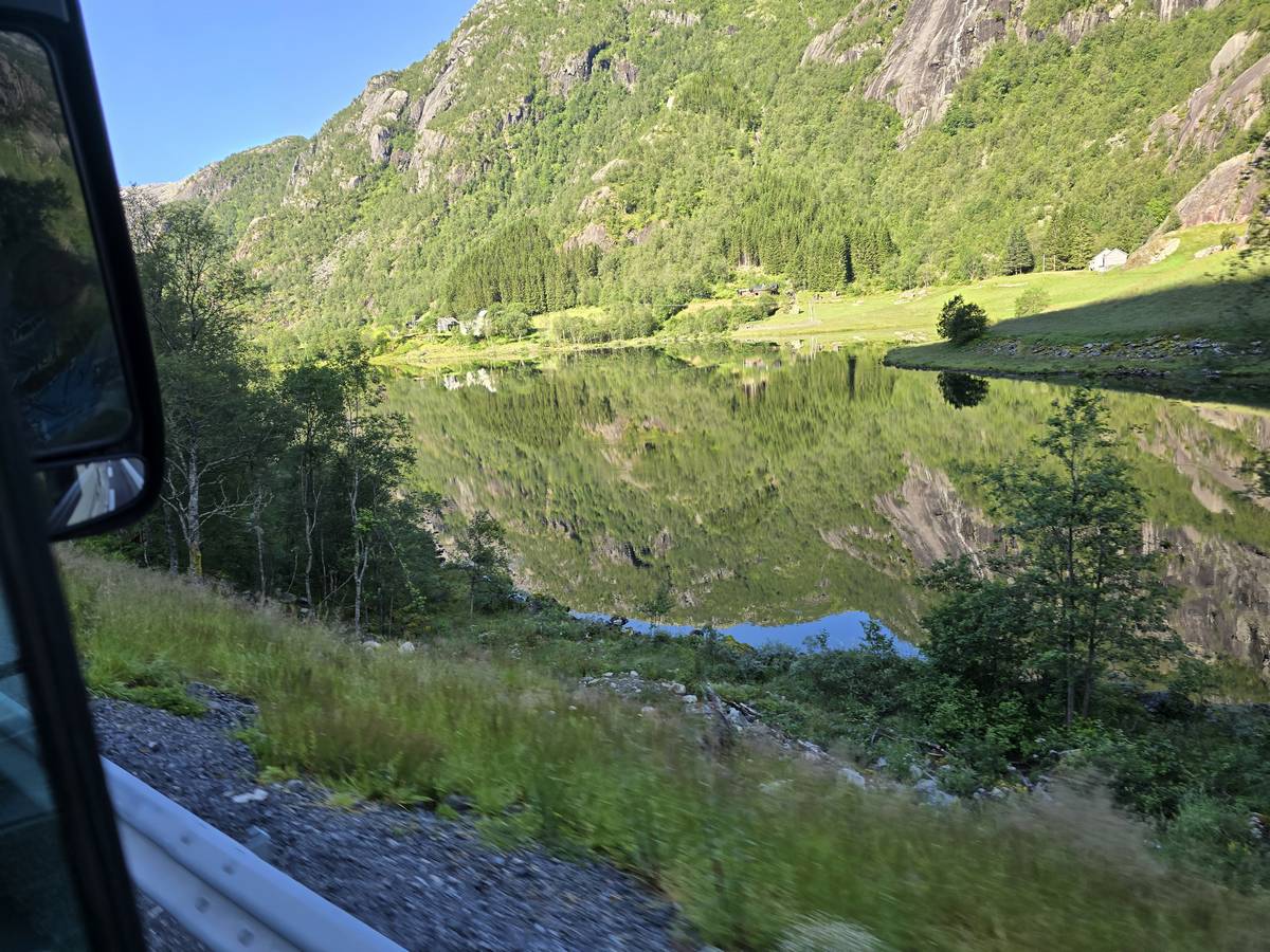 La nuit a été bonne malgré le bruit des moteurs des gros bateaux à touristes. Quand je dis nuit, c'est d'une nuit encore claire dont je parle, nous n'avons pas encore retrouvé une vraie nuit, ce n'est qu'à Jorpeland que nous retrouverons une nuit qu'on pourra appeler nuit. Ce matin, nous retournons faire un tour, cette fois dans le vieux Bergen. Il pleut, mais nous sommes bretons!!! Nous déjeunerons sur le lieu de bivouac, puis nous nous dirigeons vers les cascades jumelles de Latefossen que nous atteindrons le soir. Nous dormons sur le parking des cascades de Latefossen (Coordonnées : 59.948080, 6.583847)