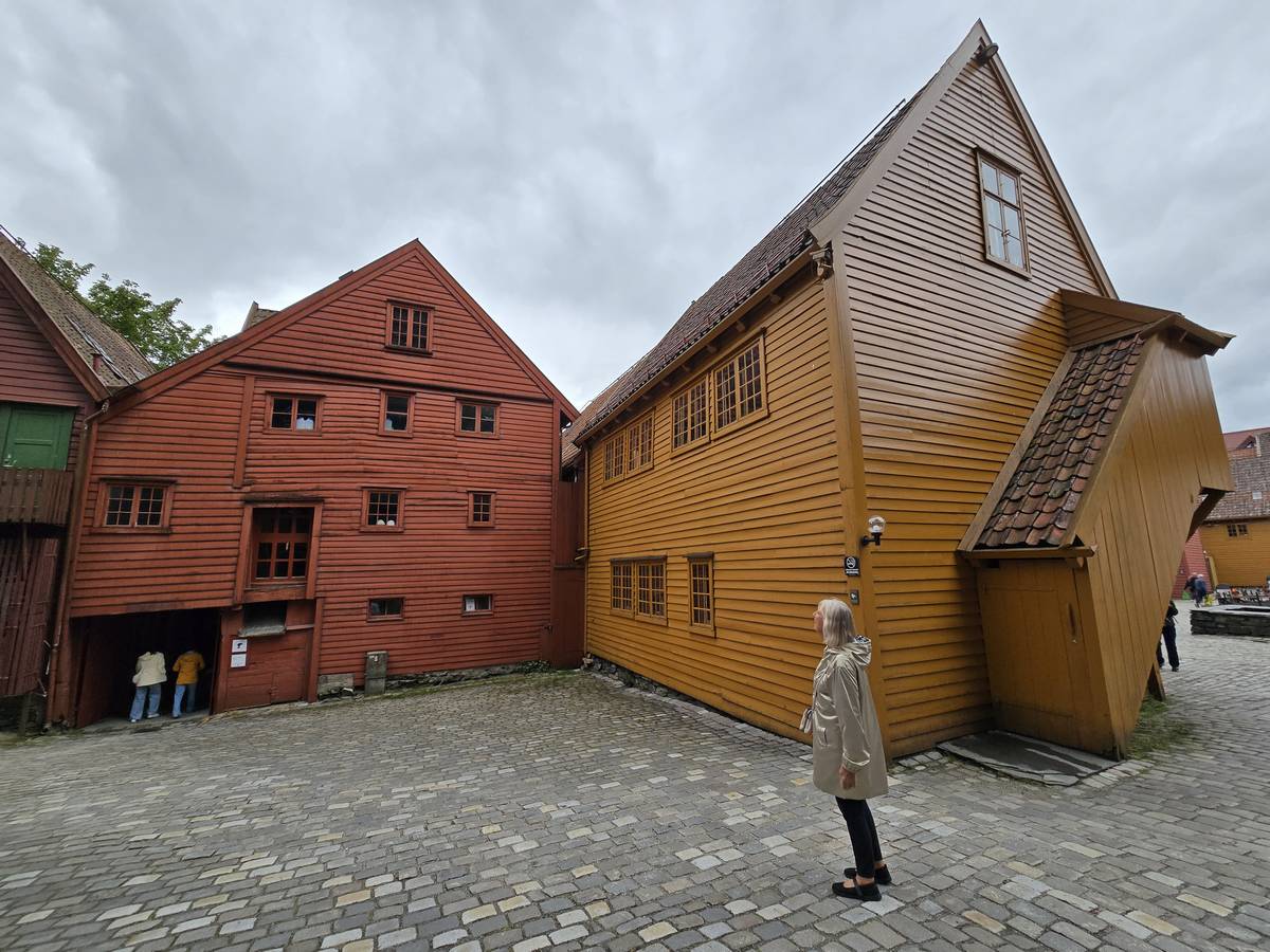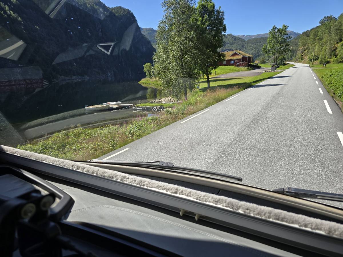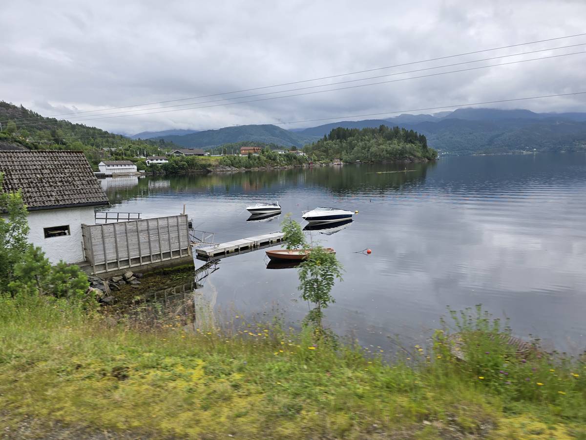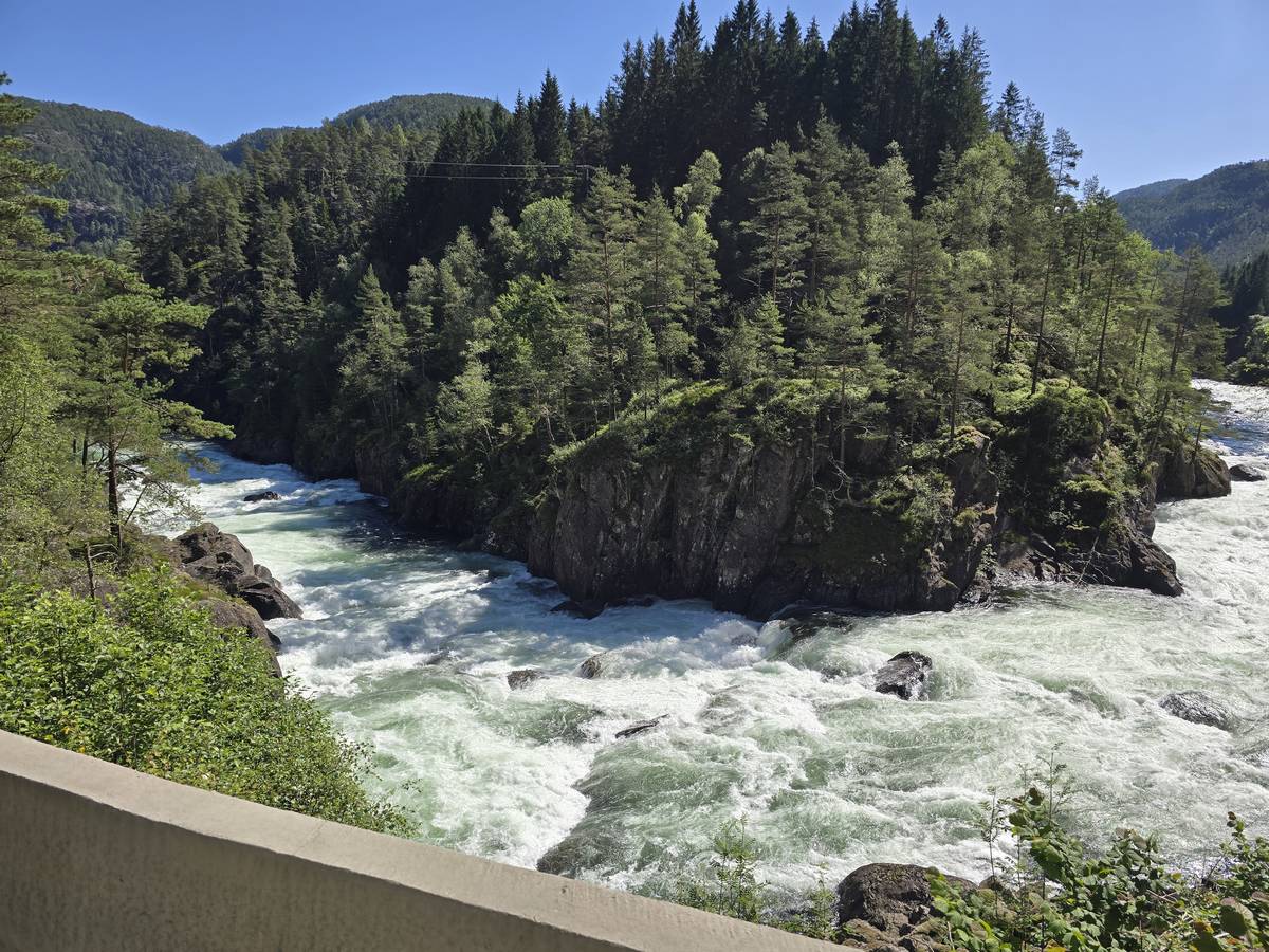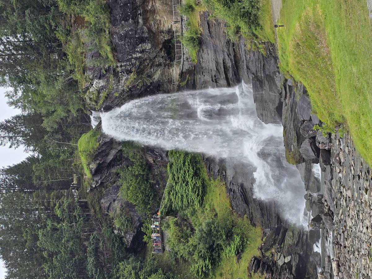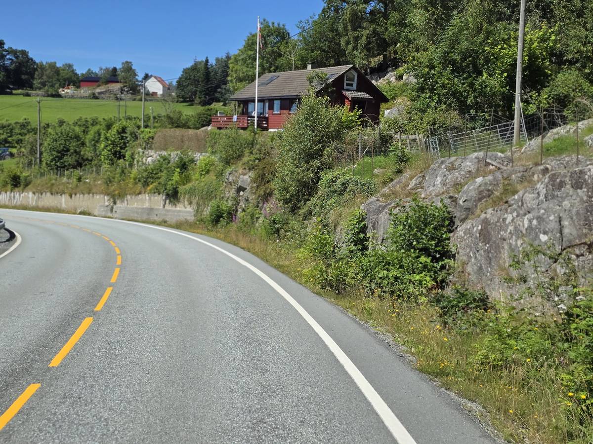 La nuit a été bonne malgré le bruit des moteurs des gros bateaux à touristes. Quand je dis nuit, c'est d'une nuit encore claire dont je parle, nous n'avons pas encore retrouvé une vraie nuit, ce n'est qu'à Jorpeland que nous retrouverons une nuit qu'on pourra appeler nuit. Ce matin, nous retournons faire un tour, cette fois dans le vieux Bergen. Il pleut, mais nous sommes bretons!!! Nous déjeunerons sur le lieu de bivouac, puis nous nous dirigeons vers les cascades jumelles de Latefossen que nous atteindrons le soir. Nous dormons sur le parking des cascades de Latefossen (Coordonnées : 59.948080, 6.583847)