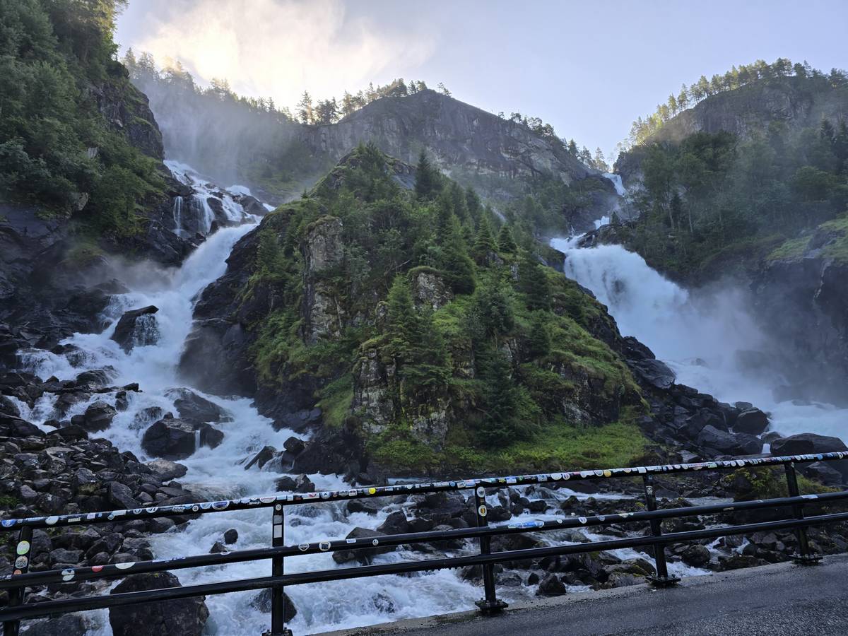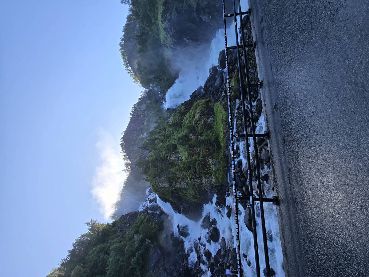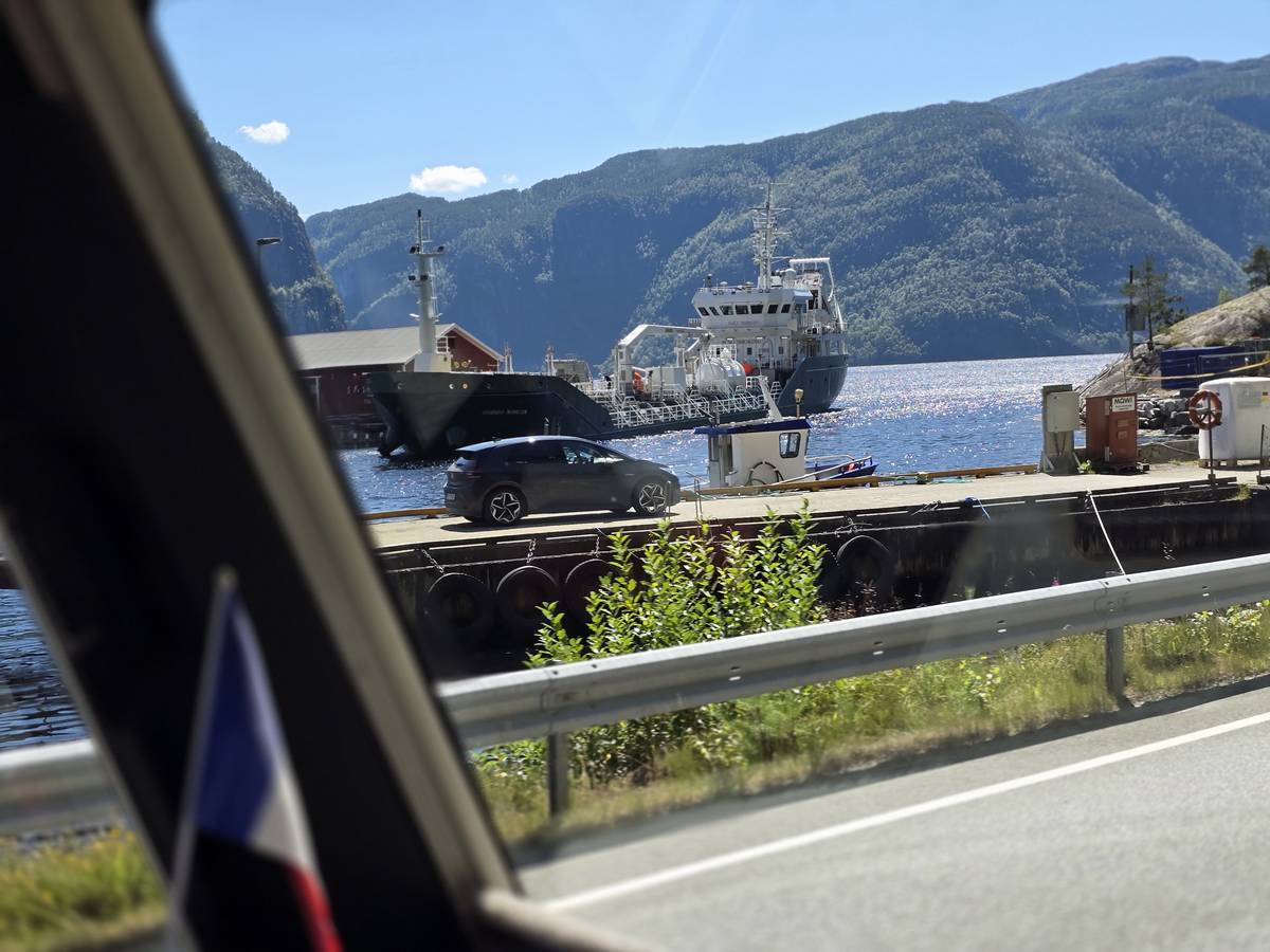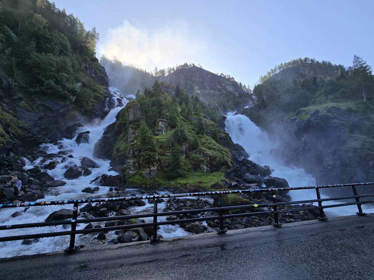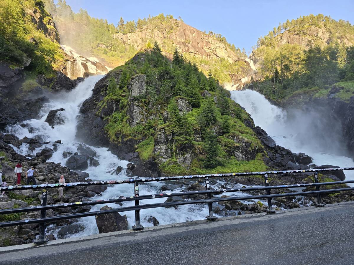 Ensuite, on continue la route qui passe par un ferry pour atteindre les cascades jumelles de Latefossen :