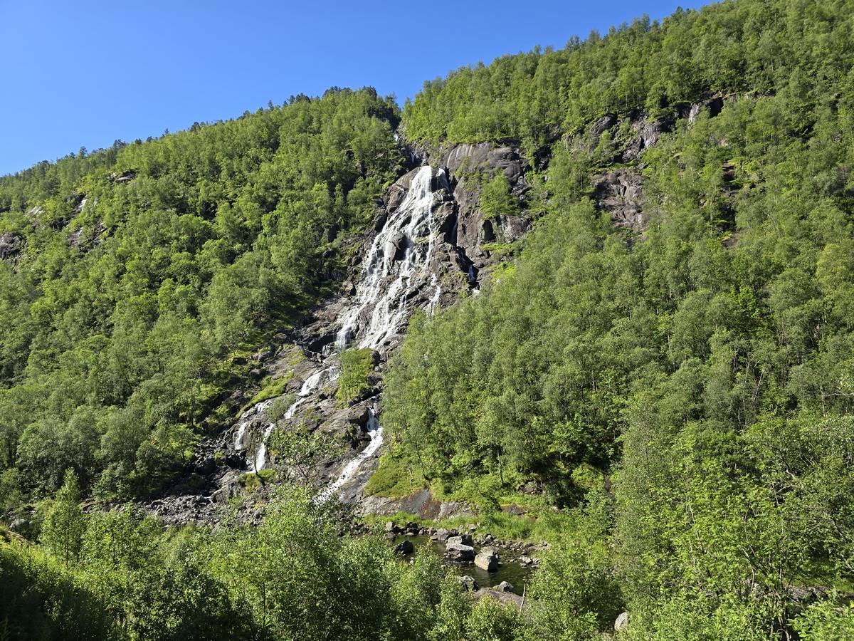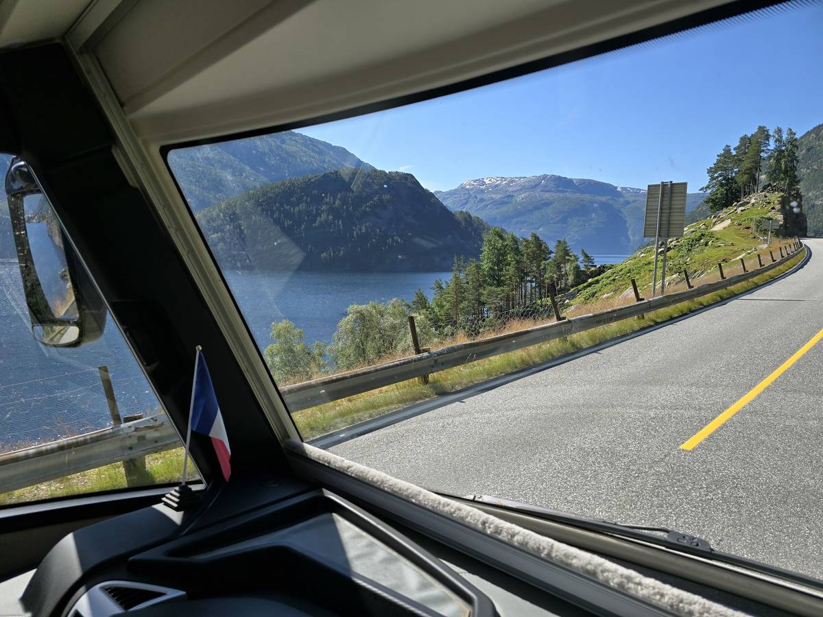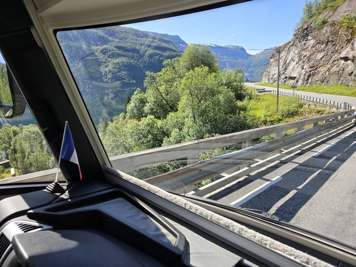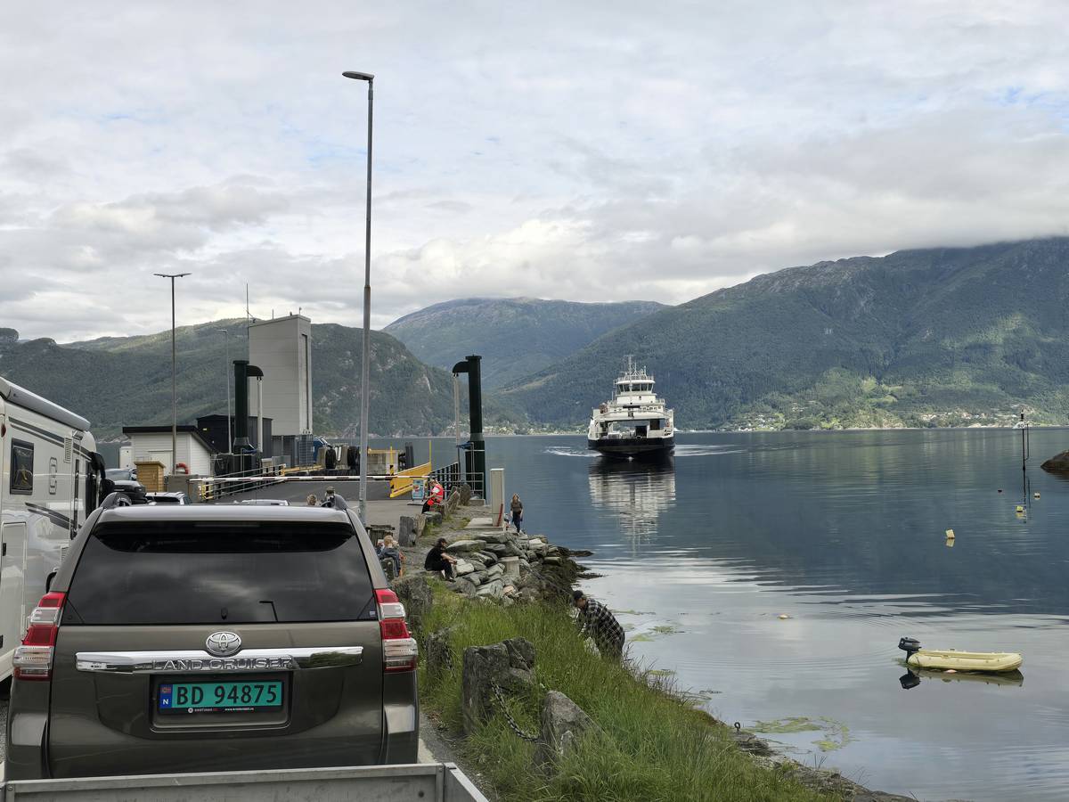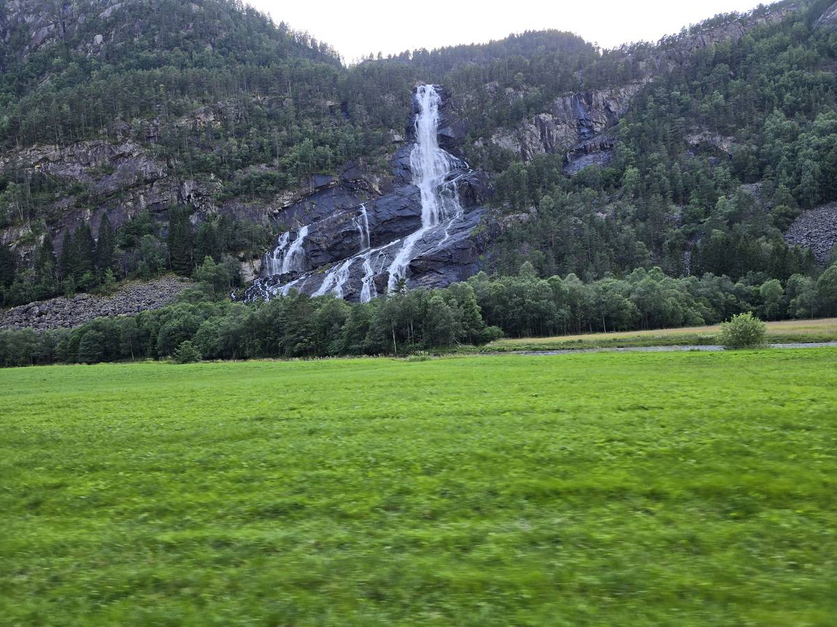 Ensuite, on continue la route qui passe par un ferry pour atteindre les cascades jumelles de Latefossen :