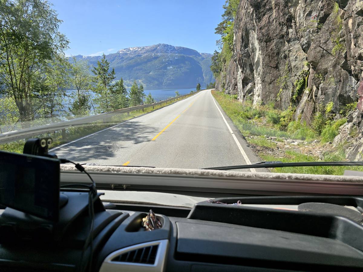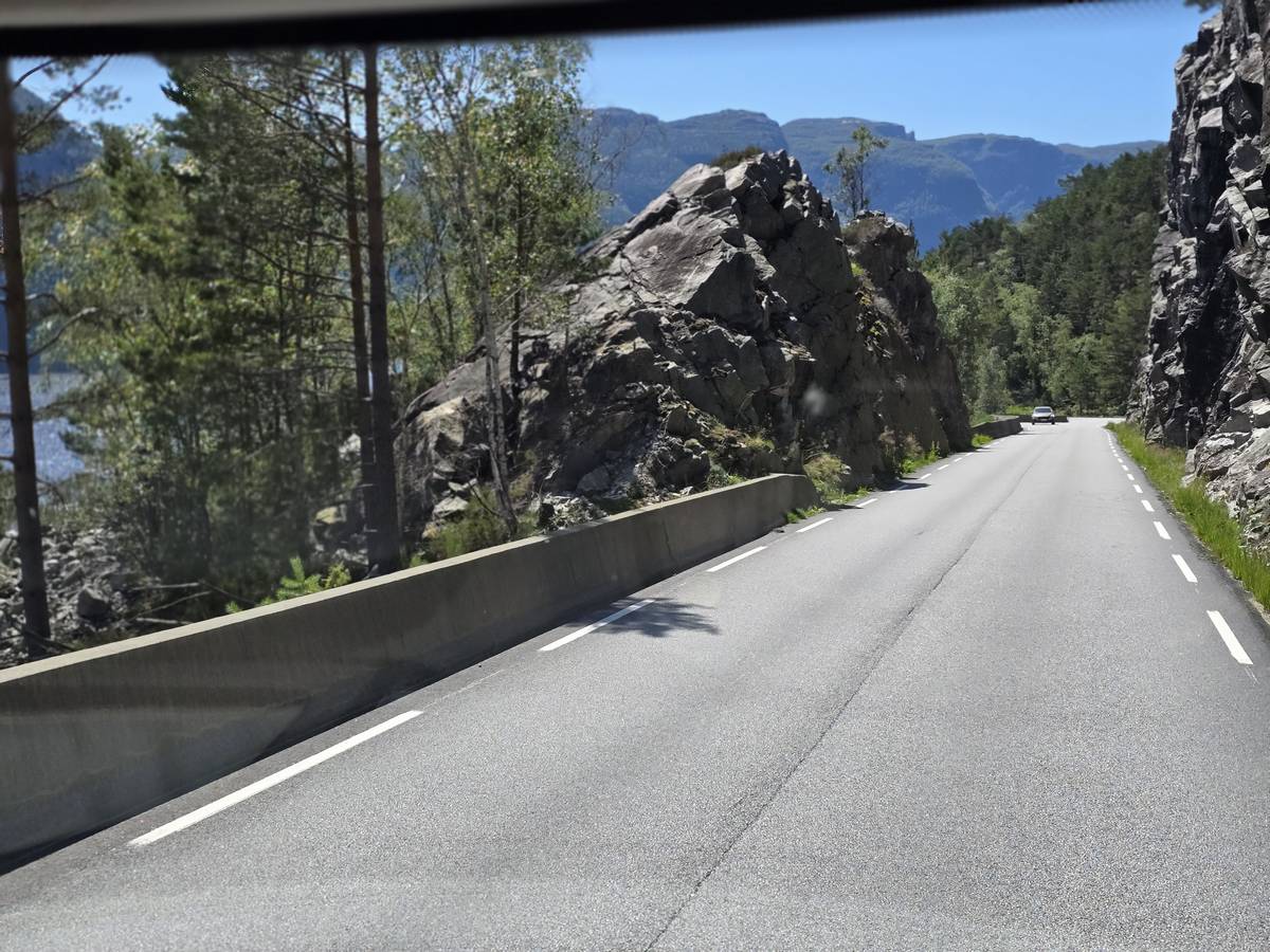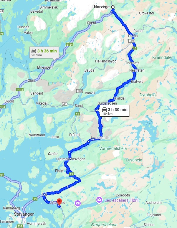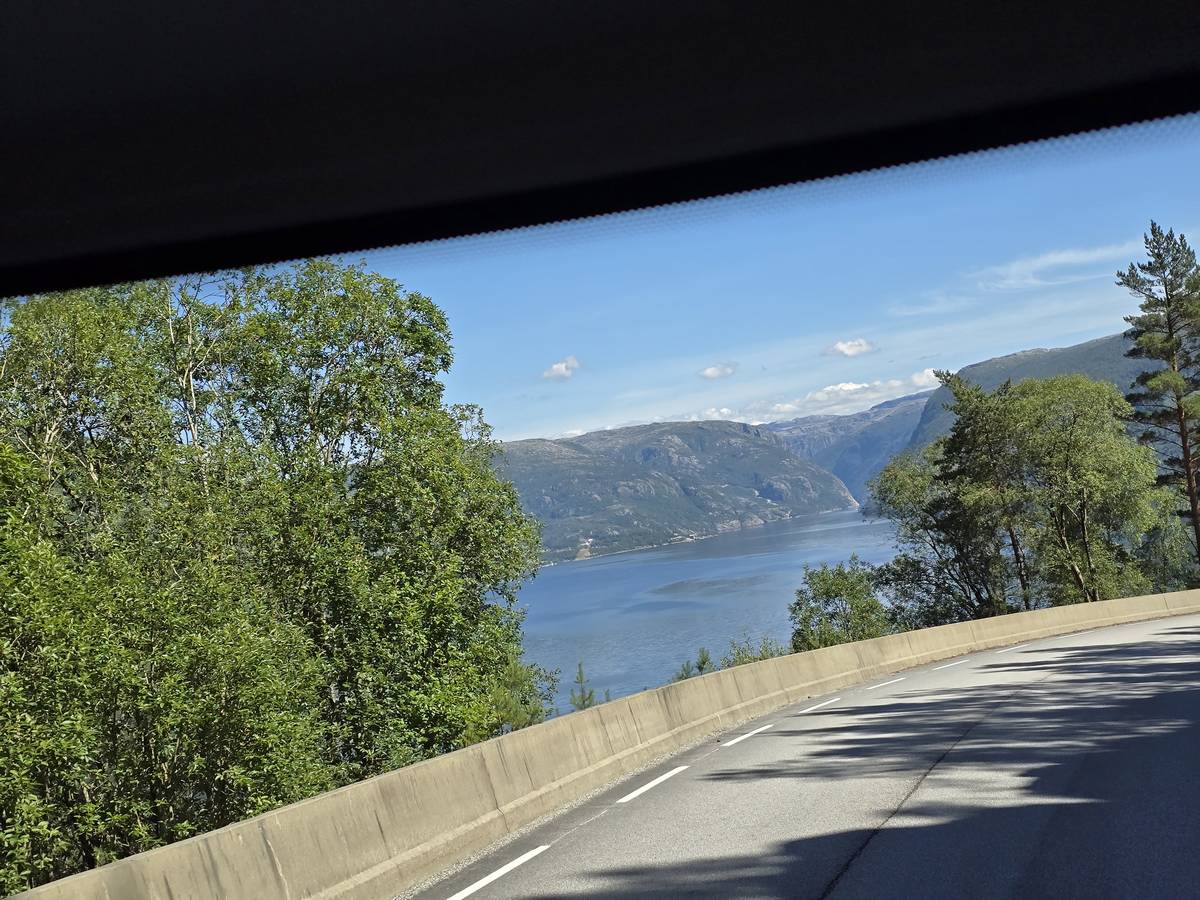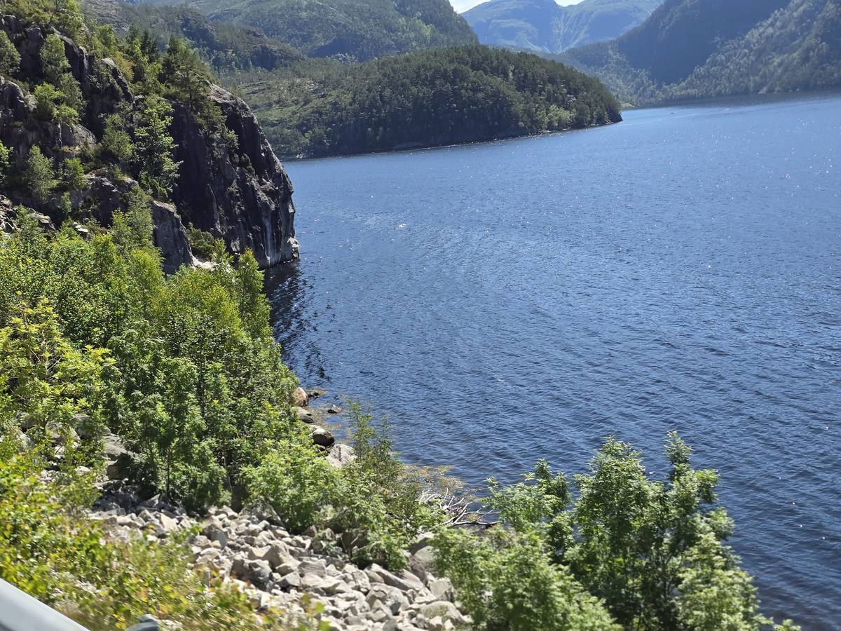 Nous quittons les cascades jumelles de Latefossen en direction du Preikeistolen, non sans avoir pris quelques clichés de ces merveilleuses chutes tombant dans un bruit étourdissant qui nous a "bercé" toute la nuit! Nous bivouaquons à Jorpeland près Preikeistolen. (Coordonnées : 59.006104, 6.060958)