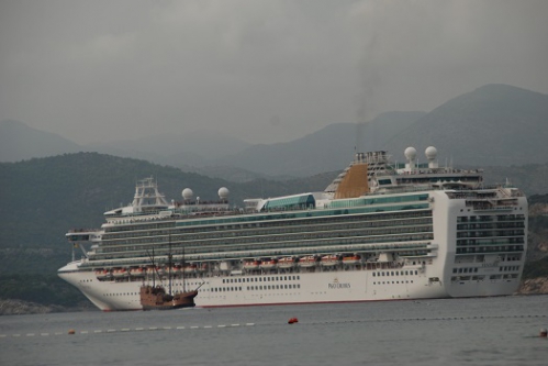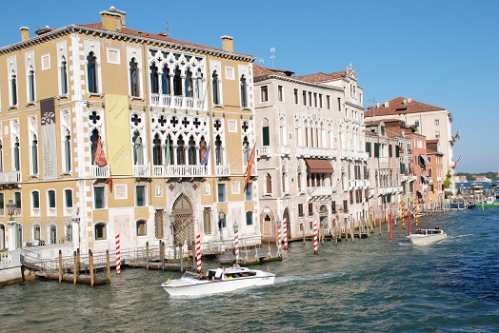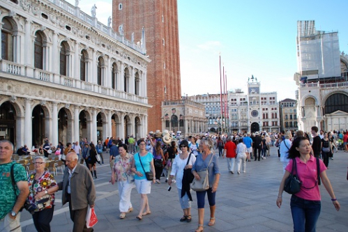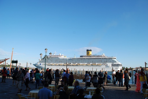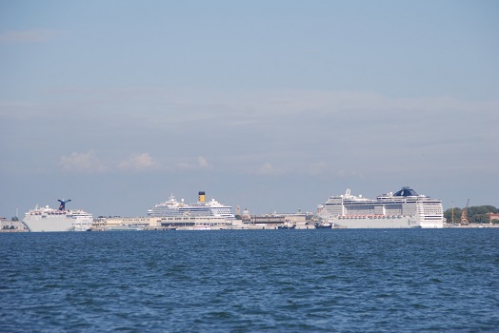 Cette photo prise du vaporetto montrent des navires de touristes accostés au bord de l'ancien parking où les camping-cars pouvaient stationner, il y a peu de temps. Ces navires passent à moins de 100 mètres de la place Saint-Marc. Il ne faut pas s'étonner dans ces conditions que Venise subisse des dégradations remarquables.
