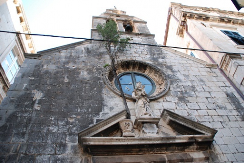 Une église en plein centre, un sapin a poussé dans le pot du fronton :