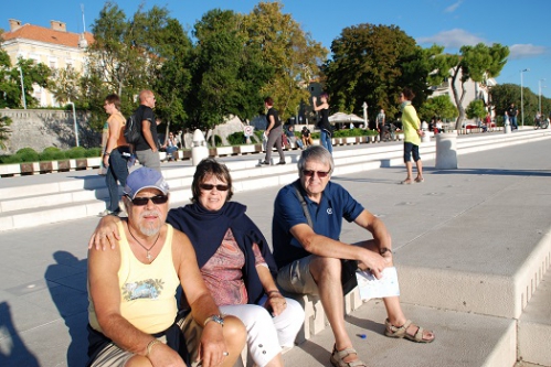 Nous sommes assis sur l'orgue marin. ça fait de la musique au son des vagues. Elle sort par les trous derrière nous et entre nos jambes, du bruit quoi !!! Imaginez trois pétomanes et vous aurez une idée de ce que l'on entendait. C'est de l'art musicale, faites marcher votre imagination !!!