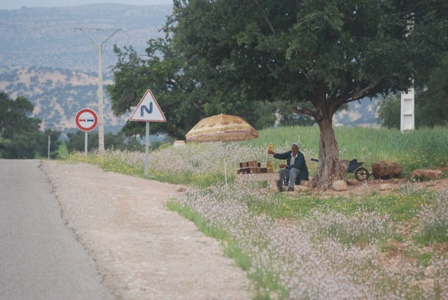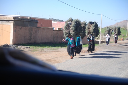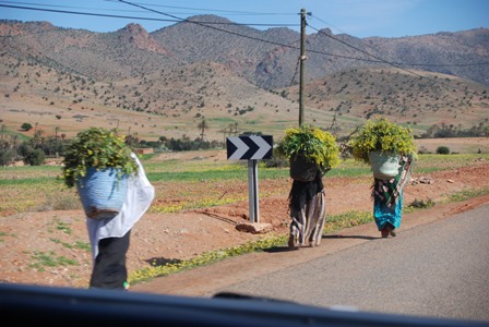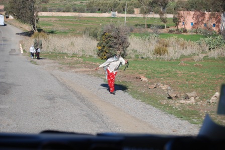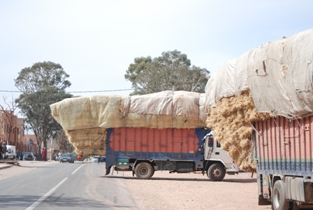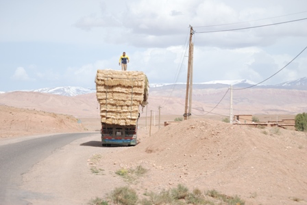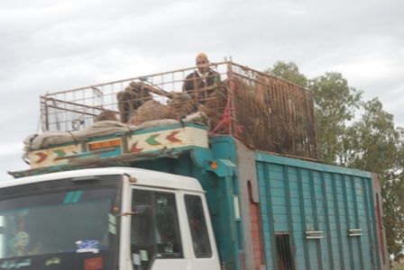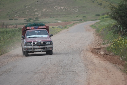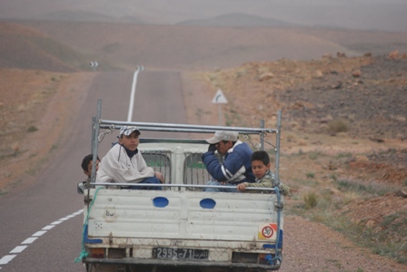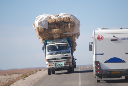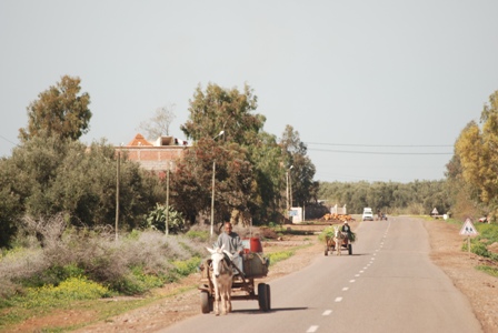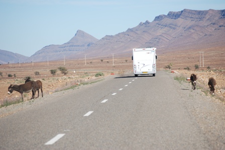 Piétons partout, stationnement des voitures et camions sur les bandes d’arrêt d’urgence, entre les 2 voies ou même sur la voie discutant avec la police de surcroît. Poules, ânes et vaches en liberté sur les bordures, nids de poule, et j’en passe, et… 151 dirhams les 350Kms (15 €).