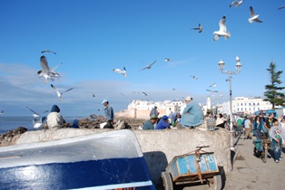 Arrivons à Souira Kedima. Une grande place ronde en bord de mer, du beau temps, mais beaucoup de vent, nous ne pouvons faire plage. Nous nous vengeons sur les poissons frais (et, entre autre également un homard), vendus à des prix très intéressants.