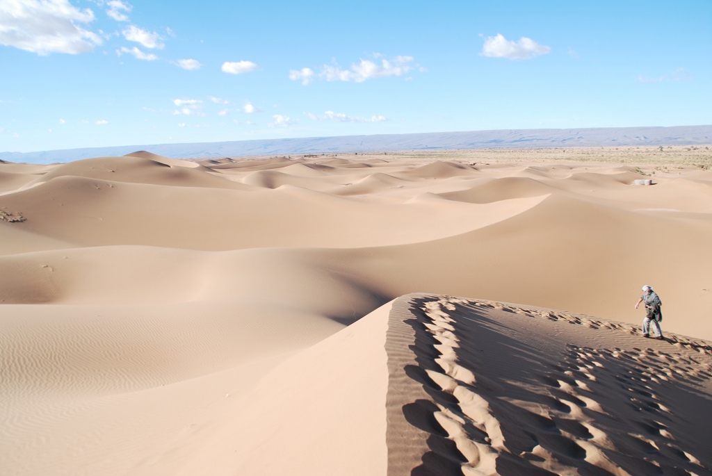 Le 8, nous nous réveillons, sous une forte chaleur 30°. Un vent chaud secoue les camping-car : le cherghi, équivalent du sirocco, est un vent chaud venant du Sahara. Il soufflera jusqu'au lendemain matin, balançant les camping-cars et amenant du sable qui s'infiltre par tous les orifices (du camping-car, bien entendu... Je vous ai vu venir!!!).