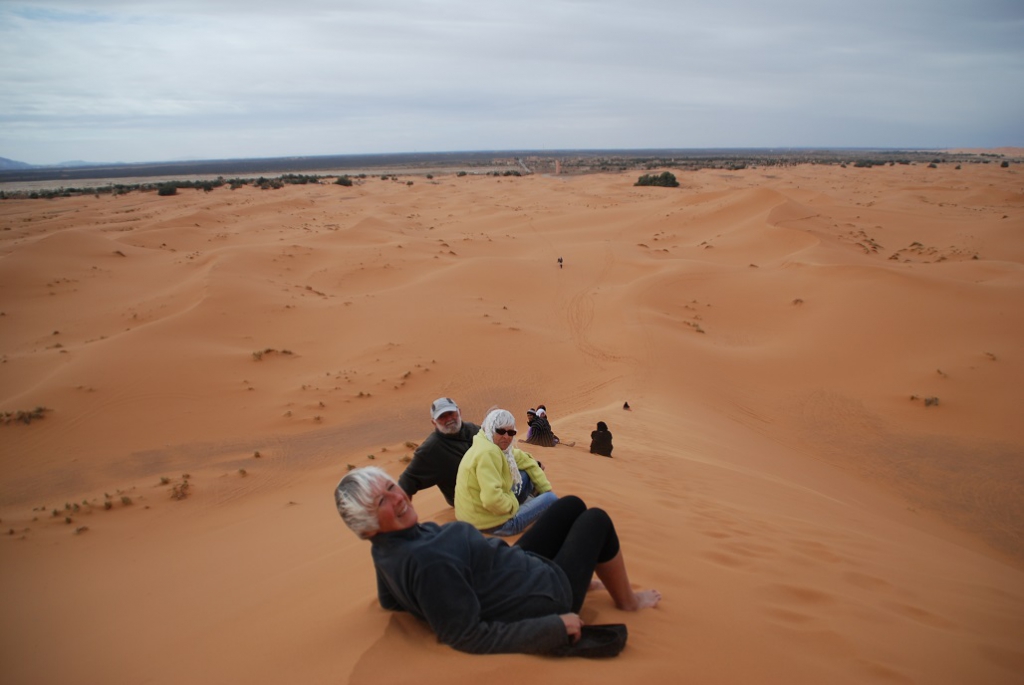 Le mercredi 29 nous roulons jusque Merzouga et atterrissons au camping "chez Françoise" au "ksar Sania". Après quelques jours de repos faits de balades, de courriers, mails et blog, nous avons monté les dunes, vendredi 31. Nous sommes partis d'un bon pied, sûrs de nous, armés de nos appareils-photo pour immortaliser l'instant et d'une grande bouteille d'eau en cas de perdition dans le désert !!! C'est sans compter qu'il y a du chemin pour arriver au pied de cette foutue dune ! J'ai l'habitude, je me suis entraîné sur la dune du Pilat !!! Courage, on monte, des pas de 40 Cms, mais comme on glisse sur le sable, on recule de 20 cms. Le vent souffle et nous envoie du sable dans les yeux. Le ciel est sombre et menaçant, on sent que la nature ne veut pas de nous. On grimpe doucement, mais on grimpe. On se fait doubler par un jeune marocain, qui escalade, pieds-nus, presque en courant. Là, c'est trop, la provocation a payé. J'essaie de faire de même et... m'écroule au bout de 2 m. Je n'irai pas plus loin. L'homme (il est jeune, environ 25 ans, ça excuse ma contre-performance) est déjà presque en haut. Du coup, la cordée s'est arrêtée et après quelques minutes de reprise de souffle, nous redescendons allègrement, vous l'avez deviné, beaucoup plus facilement que nous sommes montés. Nous étions quand même aux 2/3 de la grimpette. Ce sera pour une autre année. Ah, oui, j'allais oublié, on commençait à descendre d'un pas allègre lorsqu'une fusée nous a dépassés. Petit c-n, moi aussi, quand j'avais 20 ans, j'aurais été capable de monter et descendre à toute vvvvvvvitesse, et plus vite que toi, na. Bon, je m'énerve, il a cherché la guerre, il l'a eu !!!