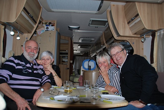 Je vais faire un tour dans le camping et... rencontre Jean-François (JFCourvoisier). A coté de lui, Micou, et à coté de Micou, une (double) place de libre. Celle-ci était occupée par les "Eligeo" partis la veille. Sans hésiter, nous plaçons les deux camping-cars, puis après quelques discussions, nous allons prendre l'apéro offert par le patron Paul. La surprise, un couple dans un coin attire mon attention !!! Je suis très physionomiste (pas du tout, vous l'aviez deviné !!!), cette personne me disant "quelque chose", je me décide à l'aborder. Eh bien oui, c'est "Anne et Max", des vannetais arrivés juste après notre déménagement dans le camping. Max était venu seul, lors de la première réunion de l'Amicale (sa constitution), en septembre 2011, à Dussac. Ce qui me rassure, c'est que, de même mézigue, Max ne m'a pas reconnu immédiatement. Devant un verre, nous avons fait un peu plus ample connaissance.