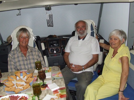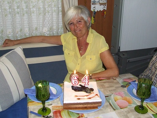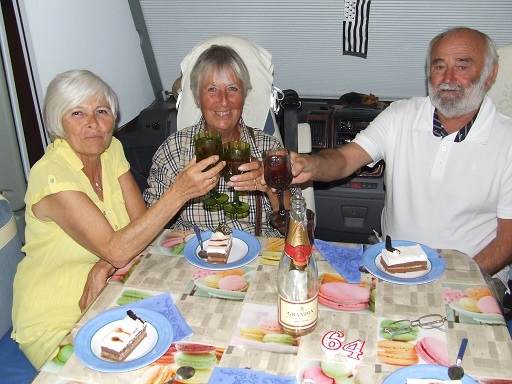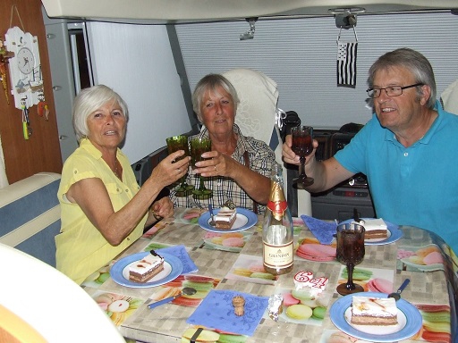Et.. le soir, apéro chez Bernard et Marie-Thérèse, puis cassoulet-maison dans notre camping-car, et enfin gâteau d'anniversaire, de nouveau, dans le camping-car de Bernard et Marie-Thérèse. Beaucoup d'allers et venues entre les camping-cars, heureusement, il fait beau et, c'est la fête du vendredi soir (friday night fever), il y a de la musique un peu partout, on pourrait croire (et on l'imagine) que c'est en l'honneur de Marie-Thérèse. A raison d'une bouteille par séjour dans un camping-car, faites le calcul, l'ambiance était chaude au moment du dessert, et la photo a été difficile à prendre tant les rires fusaient. Bref, une bonne soirée, malgré le fait que Marie-Thérèse s'est prise un an de plus !!!