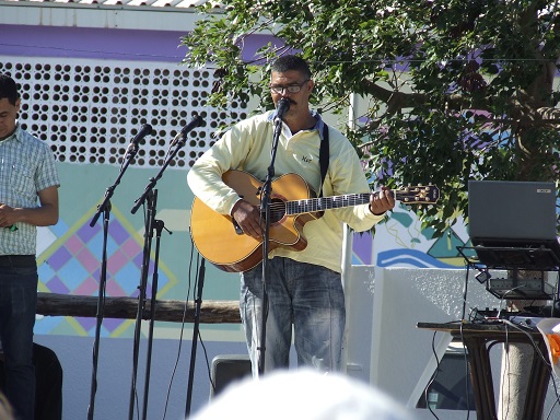 Et pour que la fête soit complète, l'après-midi, nous avions à l'entrée du camping, sur l'estrade des groupes en représentation. Nous avons eu l'accordéoniste breton du coin : Jean Deschamps, qui n'a pas pu aller plus loin qu'une chanson, le vent soufflant trop fort. Se sont succédés, un camping-cariste, avec sa guitare, qui nous a chanté quelques chansons de Luis Mariano, dont c'était le centenaire de la naissance (Luis Mariano, pas le guitariste), un autre guitariste anglais avec des chansons country, des danses country, puis l'artiste local inattendu, Freeman et sa guitare (vous le connaissez tous, le vendeur de fraises, d'asperges, de salade à l'entrée du camping !!!), enfin, de nouveau Jean Deschamps.