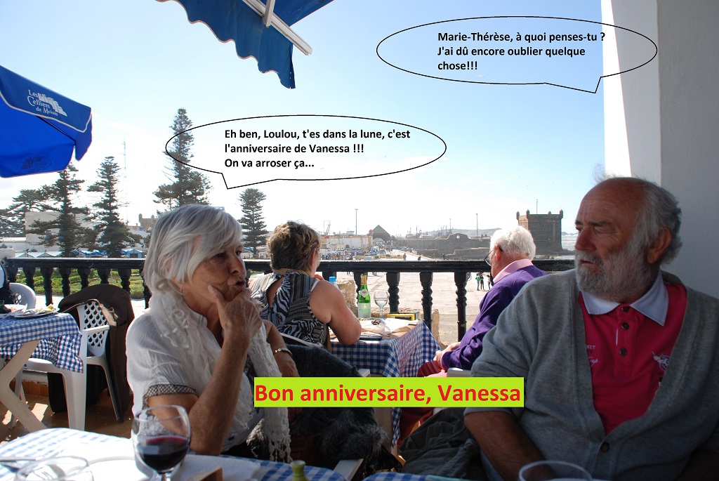 Je suis sûr que vous vous demandiez pourquoi nous ne restions pas 2 jours au même endroit. Vous pensiez que nous ne tenions pas en place, que nous avions la bougeotte, que... Eh bien, la raison, je vais vous la donner : Il fallait que le 28, nous soyons à Agadir !!! Pourquoi le 28, eh bien, je vais vous le dire (dixit Nicolas) !!! Aujourd'hui, c'est l'anniversaire de Marie-Thérèse et nous lui avions promis de le fêter à Agadir. Nous devons être samedi, c'est à dire demain, à Imi-Ouaddar, afin de réserver pour dimanche une table au restaurant près de la piscine.